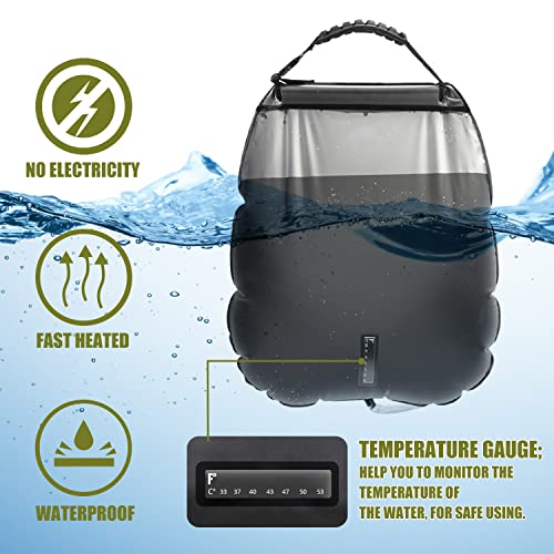 【Design che Assorbe il Calore】 La temperatura dell'acqua delle docce all'aperto può raggiungere circa 45 gradi entro 3 ore di luce solare diretta. La nostra doccia solare da campeggio è dotata di un termometro della temperatura dell'acqua per garantire un uso sicuro. Il soffione aggiornato fornisce un interruttore facile da aprire/chiudere con un flusso d'acqua da basso ad alto e una facile rotazione. Ti porta una migliore esperienza di doccia!