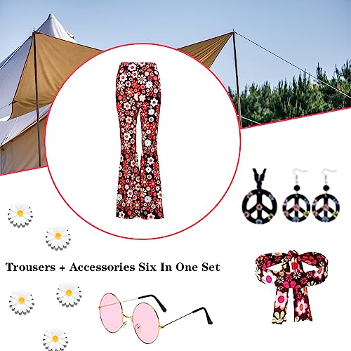 ★【Contenuto della confezione】1 paio di pantaloni con stampa hippie rosa e 1 corona floreale hippie, 1 fascia per capelli hippy, 1 paio di orecchini anni '70 e 1 paio di occhiali da sole hippie, questo abito da donna per carnevale hippie è elegante e fa una dichiarazione, in modo da essere attraente alla festa.