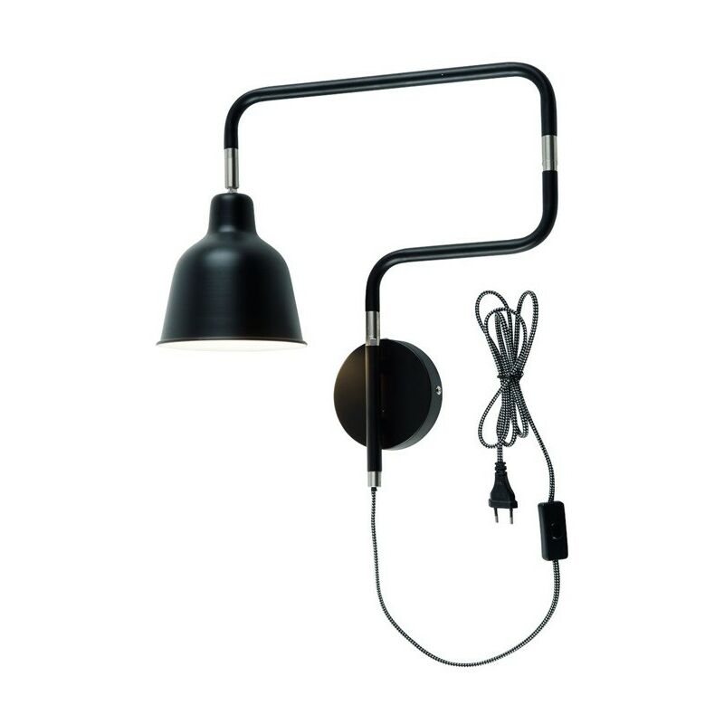 Lampada da parete dallo stile urban in metallo laccato nero struttura direzionabile e paralume orientabile. Cavo in tessuto con interruttore ON/OFF 1 lampadina E27 max 25W NON INCLUSA IP20 Lunghezza cavo elettrico 180 cm Dimensioni: L 63 cm, H 44 cm Dimensioni rosone a parete: Diametro 12 cm, P 4 cm...