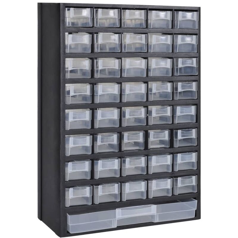 Questa cassetta porta attrezzi con 41 cassetti ( 40 piccoli, 1 grande) vi offre un modo ottimo per organizzare il vostro posto di lavoro. È perfetto per conservare tutti i tipi di piccoli oggetti come componenti, accessori, persino i vostri lavori fai-da-te. Potrete scegliere di utilizzare il cassetto grande o uno piccolo a seconda delle dimensioni degli oggetti da conservare. La plastica trasparente durevole vi offre la possibilità di vedere gli articoli che sono conservati nel cassetto. Dimensioni totali: 31 x 13,8 x 49 cm Materiale telaio: Plastica Materiale scatolato: Polipropilene Facilità di aggancio alla parete e altre superficii 40 cassetti piccoli e 1 grande