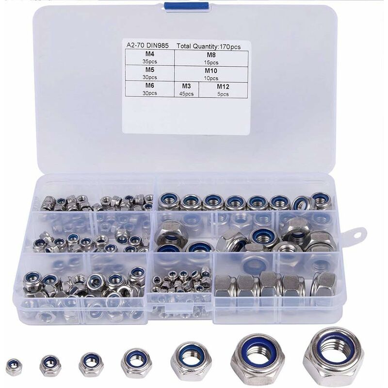 oggi. I robusti dadi con inserto in polimero sono molto resistenti. rotazione, in modo che i controdadi non si indeboliscano e si allentino sotto vibrazione e coppia, riducendo la resistenza del bagliore. Garantito per rimanere intatto e in una presa salda, rendendolo praticamente indistruttibile. M3 M4 M5 M6 M6 M10 M12 per soddisfare le diverse esigenze. I dadi in nylon sono disposti in una scatola portaoggetti, con la quale è possibile trovarli facilmente in serie ed evitare la perdita se necessario. I dadi sono conservati in una scatola di immagazzinaggio in modo da poterli trovare facilmente nella serie ed evitare la perdita se necessario. Attenzione: I prodotti contengono piccole parti. quelli. Non lasciare che i