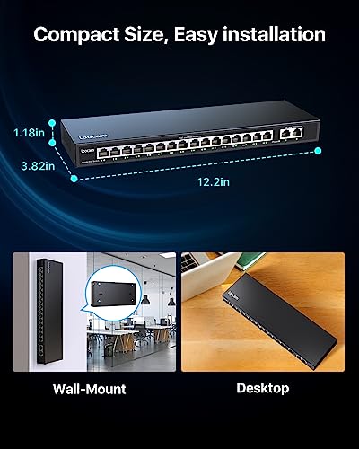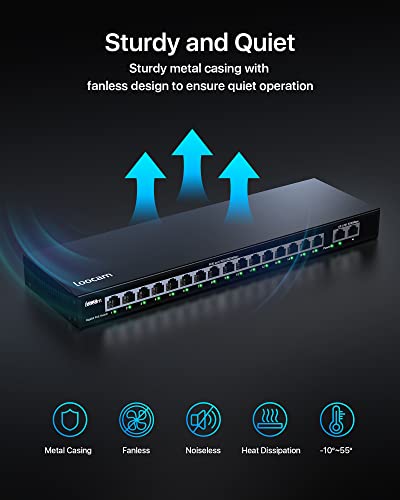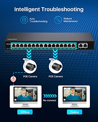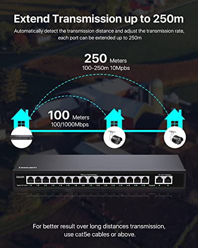 Loocam Switch PoE Gigabit 16 Porte con 2 Uplink Gigabit Ethernet, 1000Mbps per 16 Porte PoE+, 156W, Switch di Rete non Gestiti IEEE802.3af/at, Involucro in Metallo Resistente, 250m Transmission