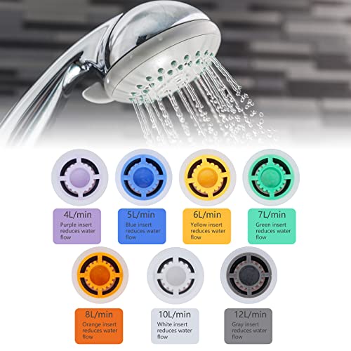 6 flussi diversi: I 6 colori dei limitatori per doccia rappresentano tutti 6 diverse portate. I limitatori viola, blu, giallo, verde, arancione, bianco e grigio rappresentano la riduzione del volume dell'acqua rispettivamente a 4 l/min, 5 l/min, 6 l/min, 7 l/min, 8 l/min e 12 l/min rispettivamente. Puoi scegliere quello giusto in base alle tue effettive esigenze.