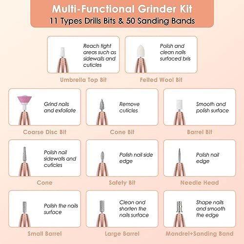 【Tagliaunghie professionale】 Questo trapano per unghie è appositamente progettato per manicure, pedicure, rimozione di unghie acriliche, gommalacca, unghie, cuticole lucidanti e pelle morta. Viene fornito con un assortimento di parti di ricambio universali da 3/32", tra cui 6 diverse punte da trapano, 5 spazzole per lucidatura, 1 spazzola, 1 lima per unghie in vetro e 50 strisce abrasive. È una buona scelta per la casa o il salone di bellezza.