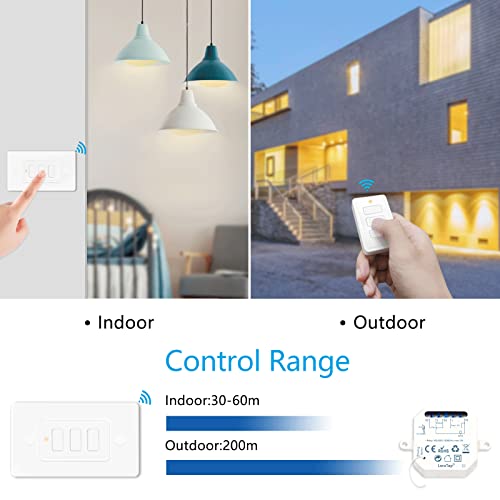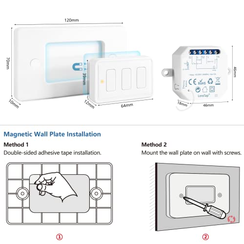 LoraTap Interruttore Luce Wireless 3 Gang, Telecomando con Base Magnetica, Interruttore Wireless Parallelo, Radio Trasmettitore a Parete e 3 Ricevitore a Relè RF 10A 100-250V AC, Bianco