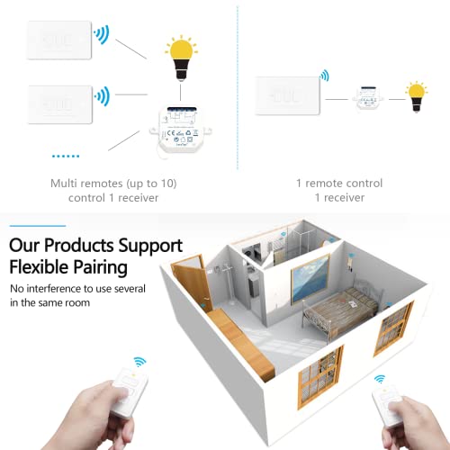 Nessuna Interferenza e Abbinamento Flessibile: ogni articolo LoraTap ha la sua identità unica e ogni kit è preaccoppiato in fabbrica, puoi utilizzare più kit nella stessa stanza senza interferenze. Più telecomandi, fino a 10 telecomandi, possono controllare un relè.