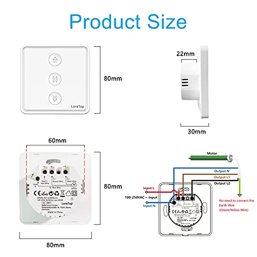 Controllo in gruppo: Puoi controllare fino a 20 interruttori in gruppo e condividerli con la tua famiglia con un clic da Smartlife. Garanzia di 3 anni. LoraTap è un'azienda specializzata in ricerca, sviluppo e produzione di switch radio e switch intelligenti da oltre 10 anni. Tutti i prodotti LoraTap sono certificati secondo le normative europee. Nota: verificare che il motore della tapparella abbia almeno 3 fili (2 fili di uscita, 1 filo neutro).