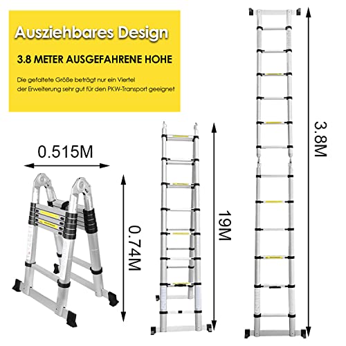 Scala telescopica pieghevole: la scala ha un design pieghevole con un'altezza di 3,8 (1,9 + 1,9 cm) e un totale di 6 + 6 livelli. Ad ogni passo il perno di sicurezza viene bloccato automaticamente, in modo che l'altezza della scala possa essere regolata secondo necessità.