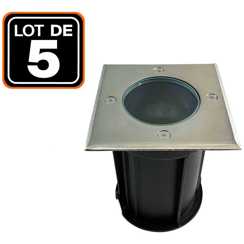Lot de 5 Spots Encastrable de Sol Carré INOX 304 Pour GU10 Idéal pour un éclairage de terrasse ou de tous type d'extérieur Il est compatible avec toutes les ampoules GU10 LED (ce qui vous permet de changer que l'ampoule, cela garantie un démontage très facile et une plus grande durée de vie). Matières: Verre épais et couvercle en Inox. Finition: Inox 304 Type d'ampoule: GU10 (vendu sans ampoule) Indique: IP65 Branchement secteur: 220-230V AC Dimension: Côtés: 11x11 cm Hauteur: 13 cm Trou de perçage: 10 cm Ce spot encastrable caré est livré avec un cable d'une longueur de 29cm. Spot encastrable de haute qualité de Marque Europalamp Garantie constructeur 2 ans Normes CE, RoHS Attention lors de la pose il est important de prévoir un drainage sous le spot, ou de mettre un joint de silicone entre la collerette et le sol pour qu'il soit entièrement étanche