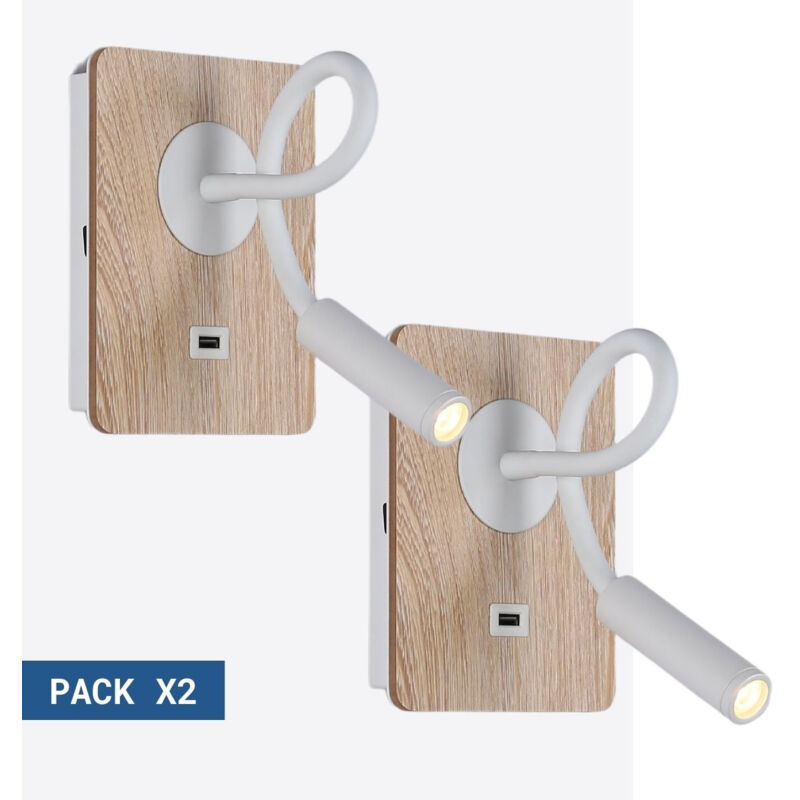 Confezione x 2 - Applique da lettura flessibile con porta USB LONDON USB L'applique da parete LONDON USB è stata appositamente progettata come lampada da lettura per la testata del letto. È dotata di un braccio flessibile regolabile, di un faretto LED 3W e di una porta USB per collegare qualsiasi dispositivo compatibile. Emette luce in una tonalità bianca calda (2800K) con un flusso luminoso di 450 lm. Si distingue per le finiture di alta qualità e per il tocco caldo dato dal legno. Disponibile in bianco.