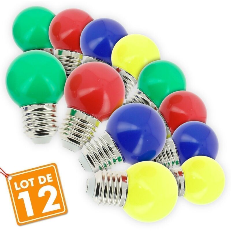 Set di 12 lampadine E27 variegate per ghirlanda festa di paese all'aperto. 3 rossi, 3 verdi, 3 blu e 3 gialli Base E27 230 Volt AC Accensione istantanea LED non dimmerabile Globo infrangibile CRI > 80 Angolo del fascio: 240° Consumo energetico: 1 W Potenza in uscita circa: 20W Dimensioni (altezza x larghezza): 69 x 45 mm Norme CE, ROHS, EMC 2 anni di garanzia del produttore Larghezza: 45 Profondità: 45 Altezza (cm): 6.9 lumen: 50 Base: E27 Classe energetica: A+ Classe energetica: G Angolo: 120 ° Tutta la vita: 20.000 heures (donnée constructeur) Alimentazione: 220 Oscuratore: Non Potenza ripristinata: Env. 20W Garanzia del produttore: 2 ans uso: Interiore / esteriore Puissance (W): 1 Tecnologia: LED Tipo di accensione: Istantaneo IP: 40