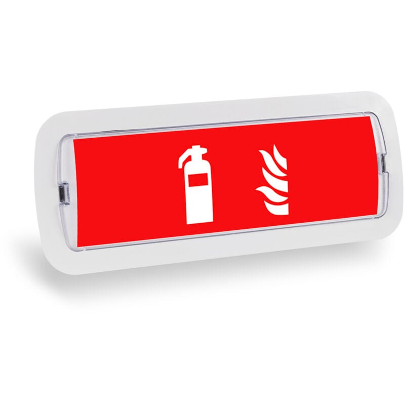 KIT pittogramma Estintore + Luce di emergenza. L'apparecchio ha una potenza di 3W e una luminosità di 250 lumen. È dotato di un sistema di accensione automatica che si attiva in caso di interruzione di corrente e ha un'autonomia fino a 3 ore. Può essere montato in superficie o incassato.
