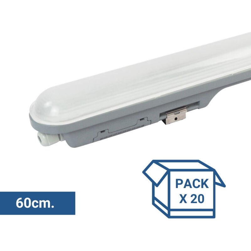 Confezione x 20 - Plafoniera stagna LED collegabile - 9W - 60cm - IP65 - 4000K Plafoniera stagna lineare collegabile, lunga 60cm con 9W di potenza, con eccellenti caratteristiche di illuminazione e impermeabilità. Grazie ai suoi materiali e al suo design con grado di protezione IP65, è un prodotto resistente all'acqua, alla polvere e ad altri agenti esterni, ideale per l'installazione in ambienti umidi o esterni.