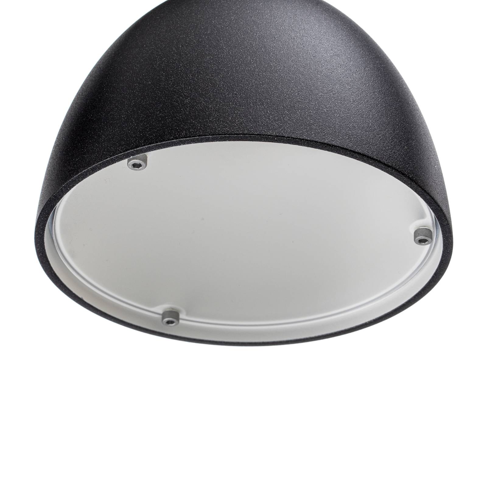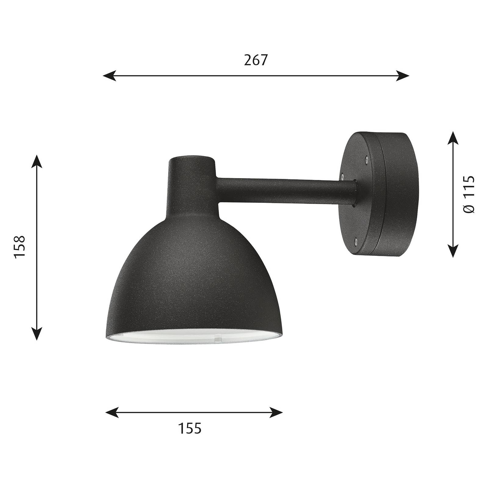 Lampada da parete per esterni con luce verso il bassooldbod in nero opaco Sia come accento su una lunga facciata che come aiuto all'orientamento nell'area d'ingresso, la lampada da parete per esterni Toldbod del rinomato produttore danese Louis Poulsen convince con una luce morbida e diretta verso il basso. A questo scopo, il paralume a forma di cupola è dotato di una copertura tagliata al laser in acrilico satinato, che diffonde uniformemente la luce della lampada E14 da inserire dietro di esso. Toldbod è completato da un braccio di supporto a forma di asta e da un supporto a parete rotondo ed è realizzato in alluminio. - Resistenza agli urti: IK05