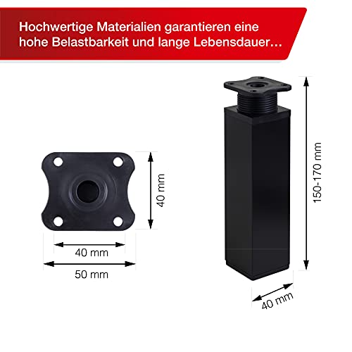 LouMaxx Piedini Regolabili per Mobili Quadrati - Set di 4-40 x 40 x 150 mm, colore nero, incl.Piastra di Montaggio - Gambe per Mobili - Piedi di alta qualità per Armadi, Cassetti, Scaffali