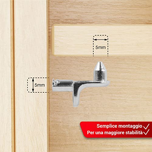 Contenuto della confezione: 50 supporti per ripiani nichelati da 5 mm, con perni per mensole con fori da 5 mm