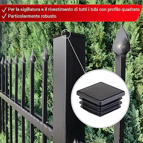 ✔️ Utilizzo versatile: con i tappi lamellari da 60 x 60 mm possono essere rivestiti e sigillati tubi in acciaio, tubi in alluminio, profili in plastica, sistemi di recinzione e tutti i tubi con profilo quadrato. Grazie alla plastica resistente, i tappi quadrati in plastica sono adatti sia per interni che per esterni. I tappi per pali di recinzione possono essere adattati grazie alle loro lamelle a diversi spessori.