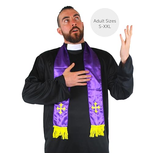 I LOVE FANCY DRESS LTD Costume da PRETE per Uomo con Croce - Tunica Lunga Nera con Collo Bianco + Sciarpa Viola con Croce Ricamata in Oro + Collana Croce d'oro - Taglia: Grande