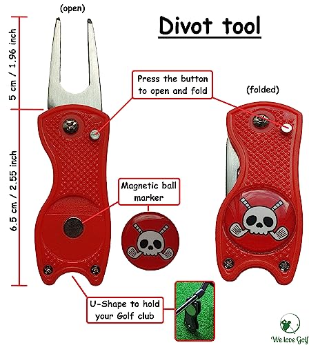 La forcella pieghevole con marcatore a sfera integrato è un must have per ogni golfista. In questo modo non solo puoi riparare facilmente i tuoi segni di lancio, ma anche segnare la tua palla per prepararti per il prossimo putt. E la parte migliore: il pennarello a sfera ha anche un fantastico design a forma di teschio