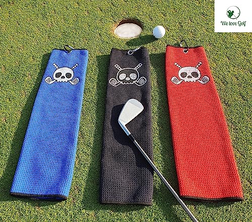 We love Golf / Asciugamano da golf, forchetta, spazzola per la pulizia, motivo teschio, set regalo (rosso)