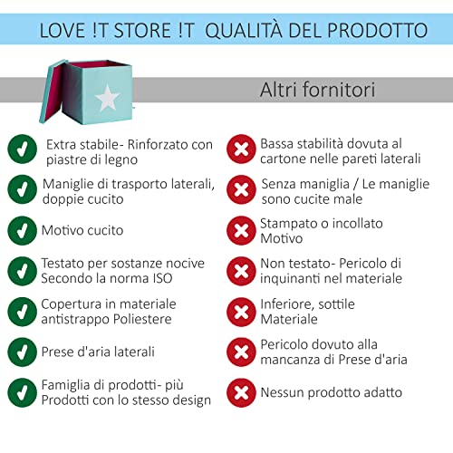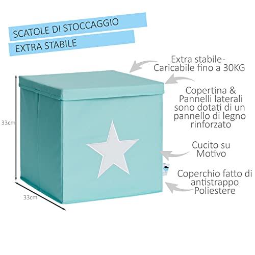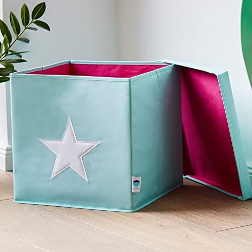 LOVE IT STORE IT - Cubo Portaoggetti Con Coperchio - Tessuto Ultra Resistente - Rinforzi In Legno - Per Cameretta Bambini - Compatibile Kallax - 33x33x33cm - Turchese Con Fantasia A Stelle in Bianca