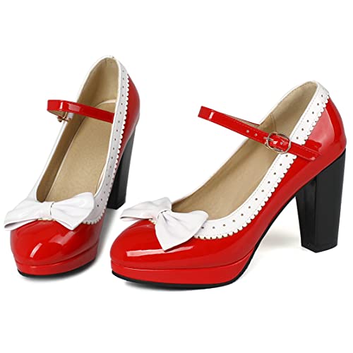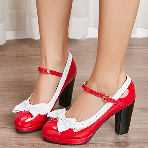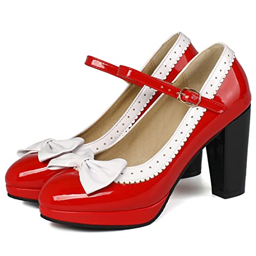 LOVOUO Mary Jane Donna Vernice Decolte Tacco Grosso Alte Rockabilly Scarpe Pumps con Plateau (40 EU, Rosso)