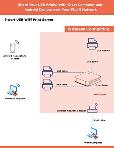Supporta la condivisione di 3 stampanti USB con ogni computer o dispositivo Android sulla rete in modalità wireless;