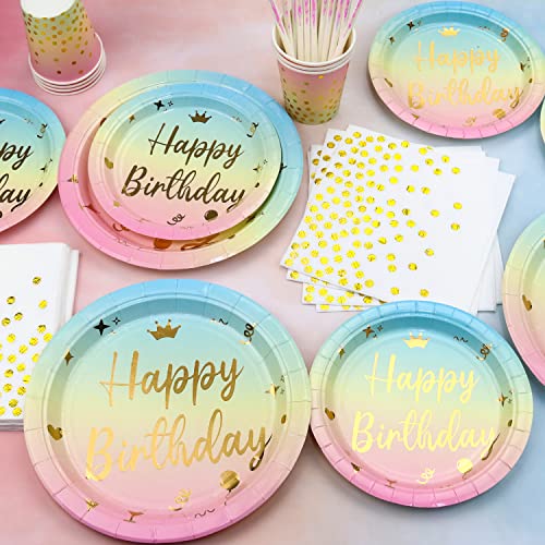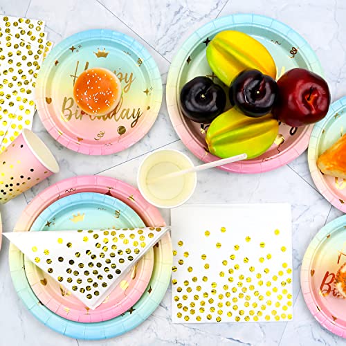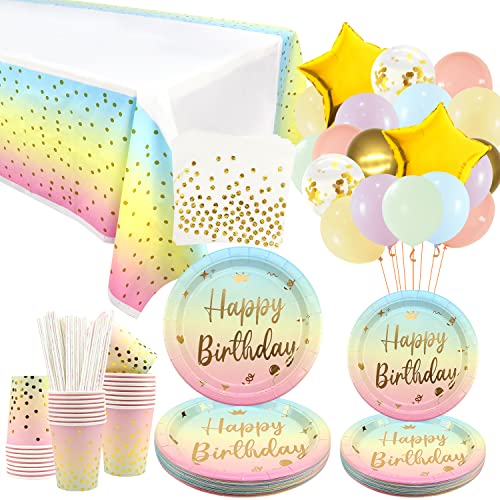 LSJDEER Forniture da tavola per Feste di Compleanno Color Arcobaleno a Pois Dorati - Piatti, Tazze, tovaglioli, cannucce, Palloncini, tovaglie per Decorazioni per Feste di Matrimonio, per 25