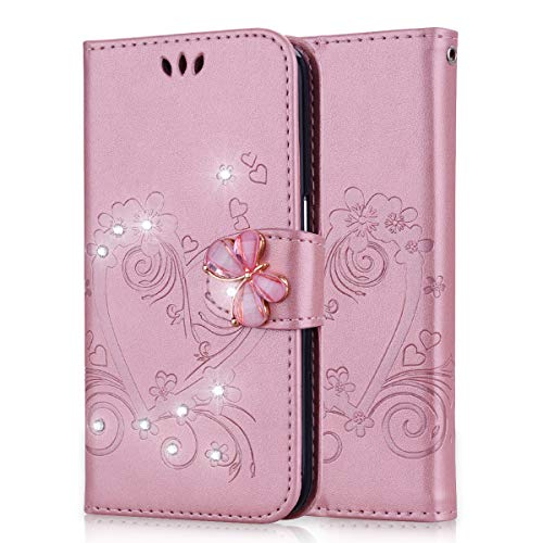 Lspcase Samsung Galaxy S5 Flip Cover, Samsung Galaxy S5 Neo Diamante Bling Libro Custodia in Pelle Portafoglio con Supporto Case per Samsung Galaxy S5 / S5 Neo Modello di Fiore Farfalla Oro Rosa