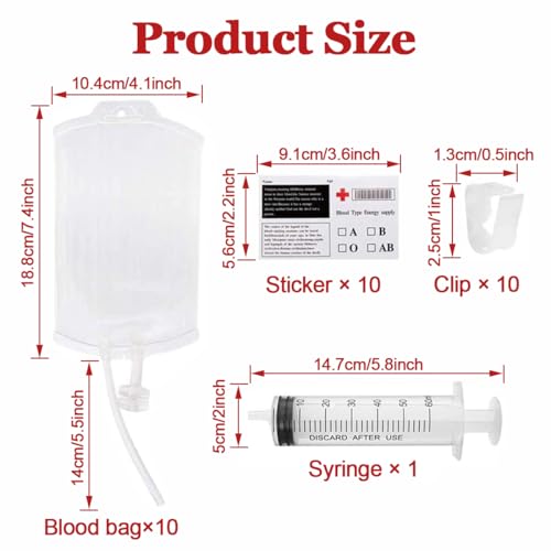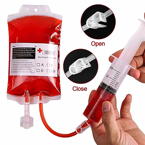 LSRVNM Halloween Sacchetti di Sangue per Bevande, 10 Pezzi Sacchi per Bevande, Contenitore per Bevande, con Adesivi del Gruppo Sanguigno e Siringa e Clip, Halloween Decorazioni, Horror Feste