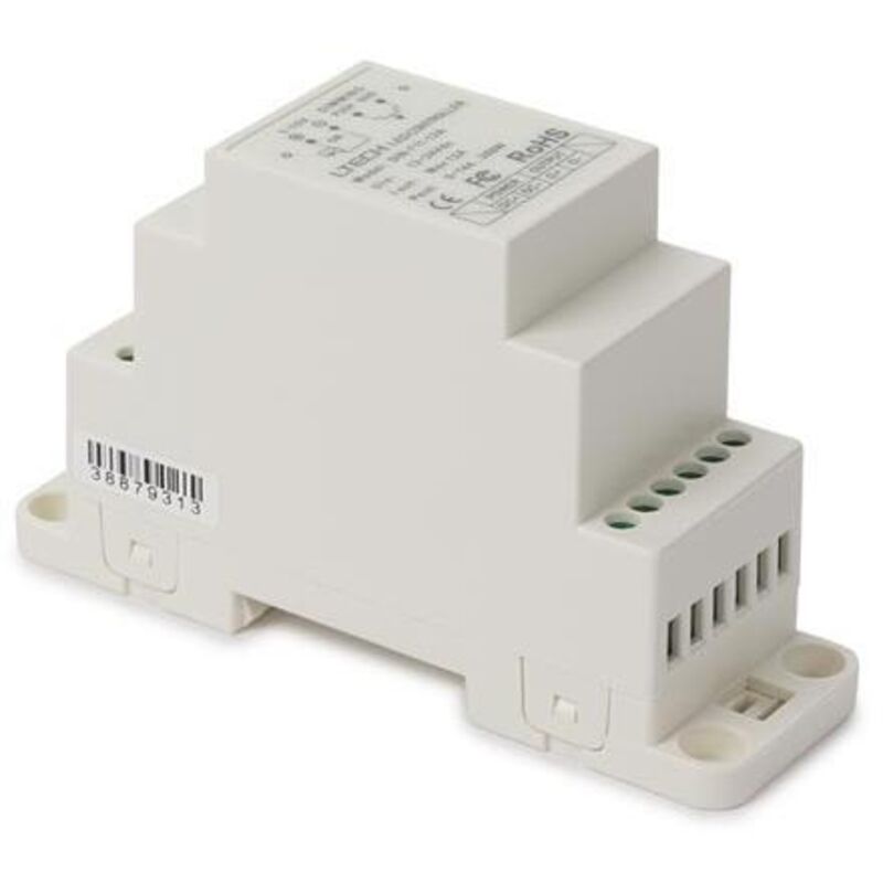 Professional DIN rail dimmer for LED strips or dimmable constant voltage LED modules. This dimmer is controllable with 0-10 V, 1-10 V, 10 V PWM signal or push button. The maximum load is 12 A current. The PWM dimming curve is adapted to the human eye. Segnale di controllo Ausgang PWM-CV,Protokoll 0-10 V, 1-10 V, Druckknopf,Dimm-Bereich 0-100%,Dimm-Kurve linear,Anzahl Kanäle 1,Kabel-Typ 2.5 mm² generale Funktionen Hutschiene Approvazioni CE ja,FCC FCC part 15:2013,RoHS2 EPA3050B:1996, EPA3052:1996, EN1122B:2001, EPA3060A:1996, EPA7196A:1992, EPA3540C:1996, EPA8270D:2007, IEC62321:2008,Schutzgrad IP20 Condizioni ambientali Betriebstemperatur -30-55 °C protezione Verpolung ja,Kurzschluss ja,Überlast ja,automatischer Neustart ja Peso e dimensioni Breite x Höhe x Tiefe 3.70 x 6.70 x 11.20 cm,Gewicht 0.12 kg Illuminazione Farbbereich eine Farbe uscita Ausgangsspannung 12 V, 24 V Dimensioni dell'imballaggio 1 Elettronica Eingangsspannung 12-24 VDC,Stromverbrauch 288 W,LED-Ausgangsstrom (max.