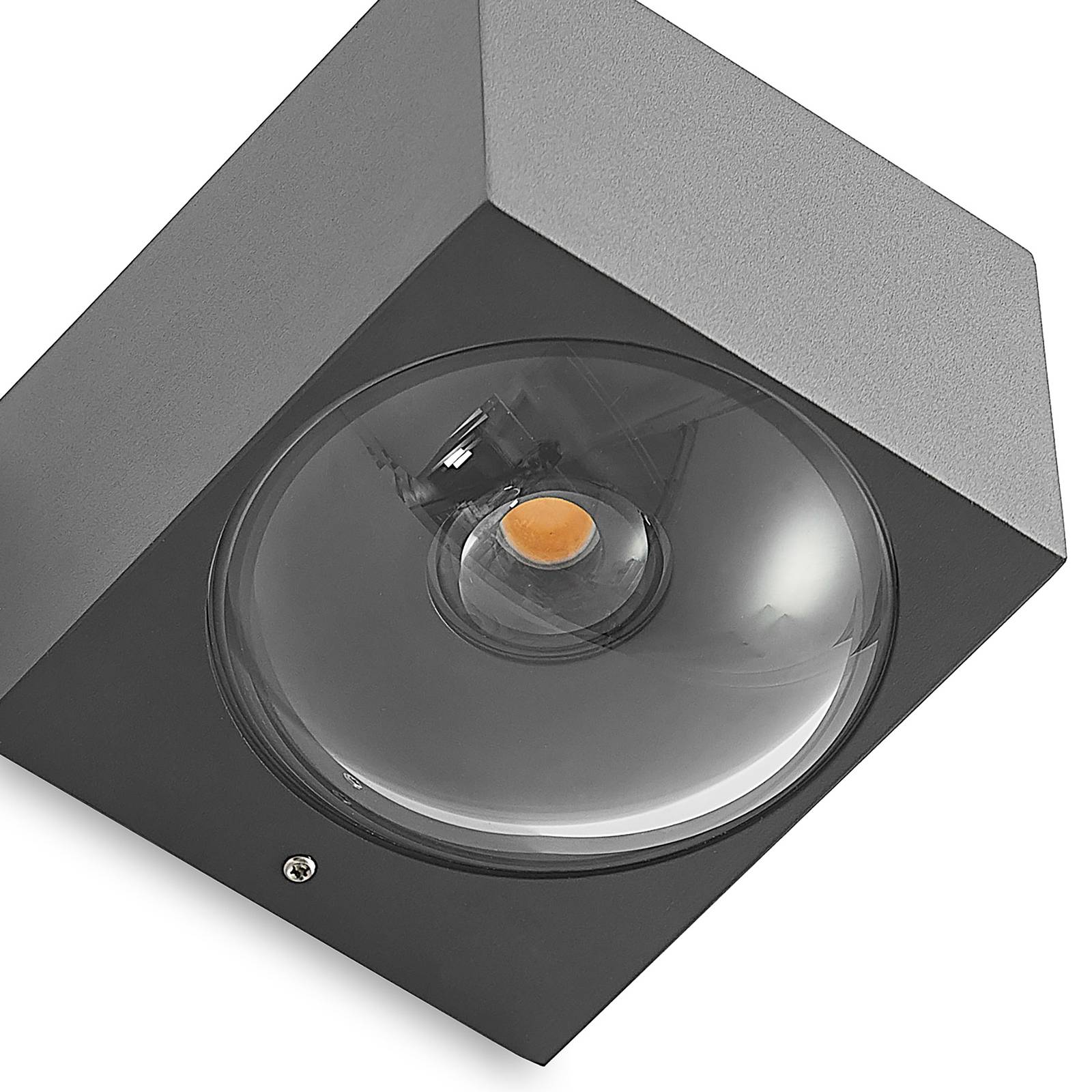 Lampada da parete esterna a LED grigio scuro Almos come moderno up- e downlight La lampada da parete a LED per esterni Almos segna con il suo straordinario design, che è sicuramente da vedere. Le due coperture del paralume sono fatte di vetro e sono emisferiche, il che arrotonda un po' l'alloggiamento angolare dell'apparecchio e dà a questo particolare look un po' più di leggerezza. Il modulo LED installato in modo permanente emette una luce bianca calda verso l'alto e verso il basso, creando bellissimi effetti di luce sulla parete della casa. Almos è una fonte di luce moderna che valorizza l'ambiente circostante e aggiunge accenti eleganti. Con protezione IP65, può essere usato all'aperto senza esitazione e per molto tempo.