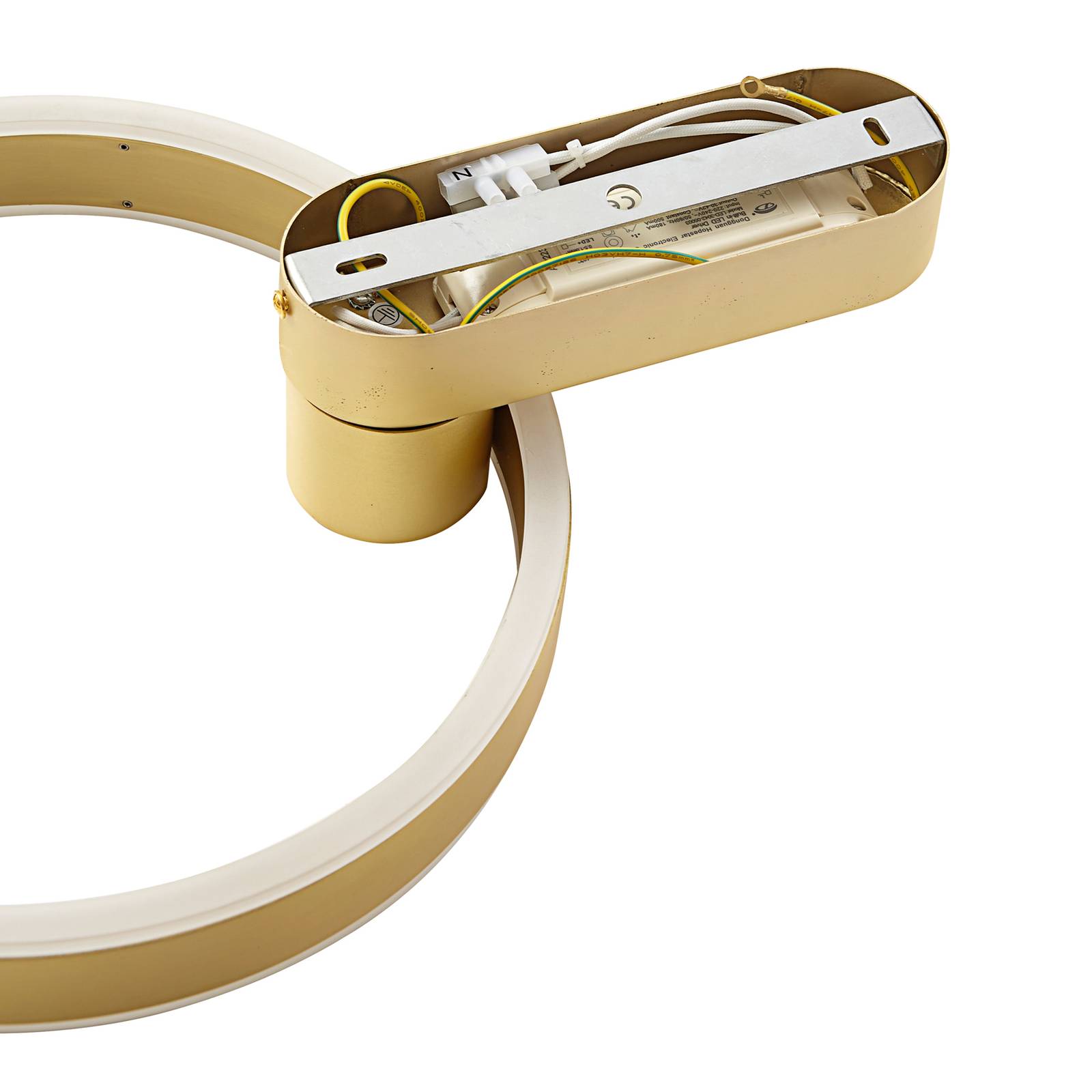 Applique a LED a luce indiretta Yekta con anello luminoso color ottone, dimmerabile tramite interruttore Yekta è un'applique di design dalla forma perfetta e dall'aspetto ben studiato, che non mancherà di stupire in soggiorno o in camera da letto, sia per la forma che per la finitura color ottone e l'effetto luminoso. Invece di un paralume convenzionale, è dotata di un anello illuminato con LED sul retro, in modo che la luce bianca calda sia percepita principalmente come indiretta e contribuisca in modo significativo all'atmosfera accogliente della stanza. Inoltre, la luminosità può essere regolata in tre fasi tramite il normale interruttore a parete, il che consente una maggiore flessibilità in termini di illuminazione. La finitura in ottone conferisce al design moderno un tocco leggermente più classico. Dimmerabile in 3 fasi: un interruttore a parete consente di accendere e spegnere la luce come di consueto. Grazie alla tecnologia di dimmerazione a 3 fasi con funzione di spegnimento integrata, è possibile dimmerare la luce a tre diversi livelli di luminosità premendo più volte l'interruttore: 100 %, 50 % e 10 %.
