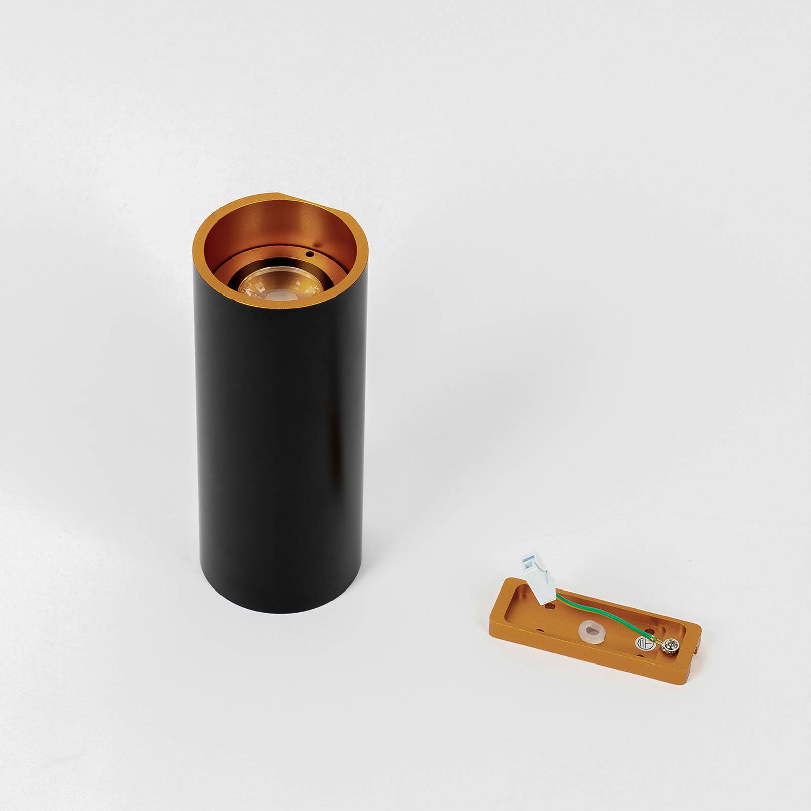 Apparecchio da parete per esterni a LED scuro Benidetta con emissione di luce verso l'alto e verso il basso L'apparecchio da parete per esterni a LED Benidetta è un'elegante soluzione illuminotecnica per aree di ingresso o patio dal design moderno. Il design di ispirazione geometrica appare semplice ed elegante allo stesso tempo. L'alloggiamento cilindrico è stato rivestito con una finitura nera, mentre l'interno dell'apparecchio è stato progettato in una calda tonalità oro. In questo modo si ottengono accenti di luce particolarmente caldi che, insieme al colore bianco caldo della luce, creano un ambiente invitante. Questo apparecchio sottile può essere utilizzato anche in una fila di più apparecchi, decorando così perfettamente la parete della casa.