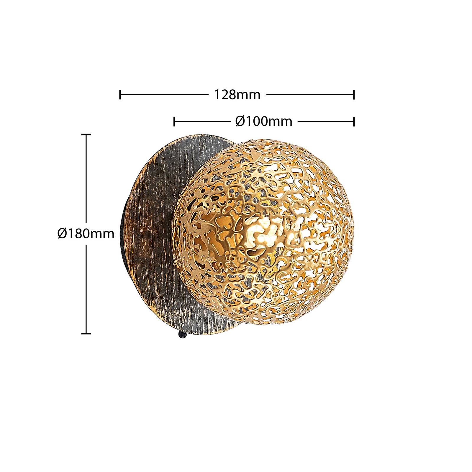 Lampada da parete sferica Evory con motivo a filigrana La lampada da parete Evory ispira grazie al suo paralume rotondo con un bel disegno. La tonalità è in ferro e dipinta di colore dorato. Ciò che lo rende speciale è il modello. Questo rende la lampada dall'aspetto marocchino e completa perfettamente una casa con elementi d'arredo simili. Inoltre, la luce fornisce meravigliosi accenti di luce. Questo perché la sorgente di luce si trova all'interno della sfera e brilla contro il metallo da dietro. Questo crea un affascinante gioco di luci e ombre