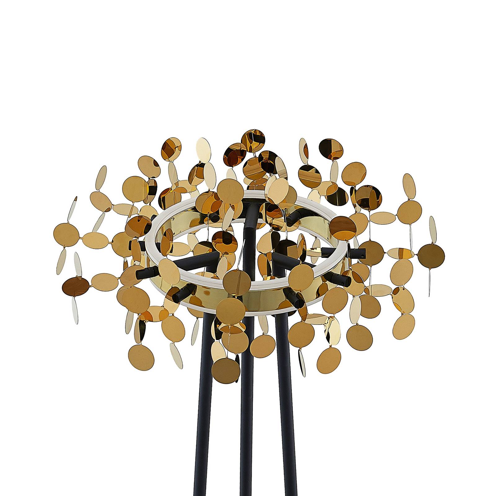 Lampada da terra Glimmo LED in nero con elementi decorativi color ottone La lampada da terra Glimmo LED è stata realizzata in ferro, alluminio e acrilico. Ha un design insolito in nero e ottone, che rende l'apparecchio molto attraente anche quando è spento. Il modulo LED, installato in modo permanente nel paralume ad anello, emette una luce bianca calda che può essere regolata a piacere. La luce viene emessa senza abbagliare tutto intorno, in modo da essere distribuita uniformemente nella stanza. Questo apparecchio è in grado di valorizzare immediatamente le vostre quattro pareti, ma anche di essere utilizzato nel settore alberghiero o della ristorazione. 3-step-dim off: Un interruttore consente di accendere e spegnere l'apparecchio come di consueto. Grazie alla tecnologia di oscuramento a 3 fasi con funzione di spegnimento integrata, può essere regolato su tre diversi livelli di luminosità (100 %, 50 % e 10 %) premendo più volte l'interruttore.