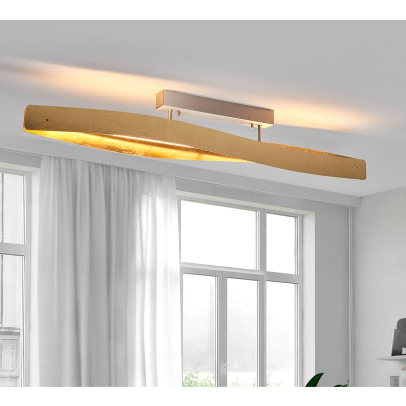 Made in Germany - esclusiva plafoniera Lian con LED dimmerabili La plafoniera LED Lian è un oggetto di design che sa impreziosire ogni ambiente. Anche da spenta cattura immediatamente ogni sguardo con la sua irresistibile finitura dorata. Indubbiamente è un corpo illuminante per chi apprezza un design esclusivo. A conquistare è non solo la lavorazione eccellente ma anche l'effetto di luce che crea un'atmosfera splendida. Pregiato metallo battuto e luce avvolgente dei LED: sono questi i tratti distintivi che conferiscono alla plafoniera un carattere irripetibile. Due lamine di alluminio si avvolgono con eleganza attorno ad un sottile profilo centrale che alloggia i LED, puntati sia in alto che in basso. La luce emessa si riflette sul metallo dorato mettendone in evidenza le artistiche irregolarità dovute al processo di battitura. Essendo lavorata interamente a mano, ogni lampada è un prodotto unico. La plafoniera non teme confronti nemmeno in termini di funzionalità. I LED di questa