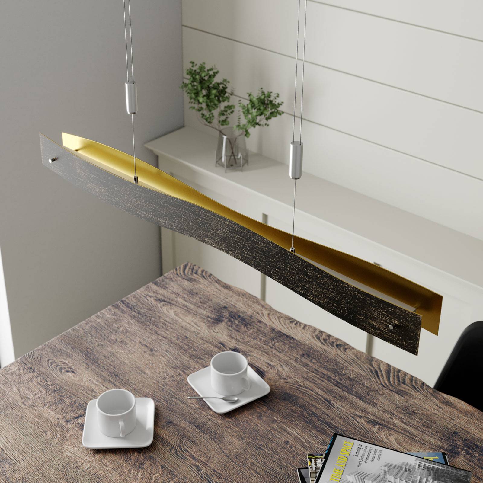 Lampada LED a sospensione Ebu dimmerabile su tre livelli con meccanismo saliscendi Ebu è una lampada LED a sospensione ideale per illuminare il tavolo da pranzo, anche grazie alla sua forma allungata. La luce è gradevole, sia per i LED di colore bianco caldo, sia per i due pannelli che eliminano ogni effetto abbagliante. Il lato esterno del paralume di forma allungata è nero con effetto oro spazzolato, mentre il lato interno, completamente dorato, riflette la luce rendendola calda e morbida. Una caratteristica apprezzata: l'altezza di questa lampada a sospensione LED può essere regolata facilmente tra 110 cm e 200 cm. Inoltre, Ebu è dimmerabile tramite il normale interruttore a parete. L'intensità luminosa può essere regolata su tre livelli (100%/50%/25%).