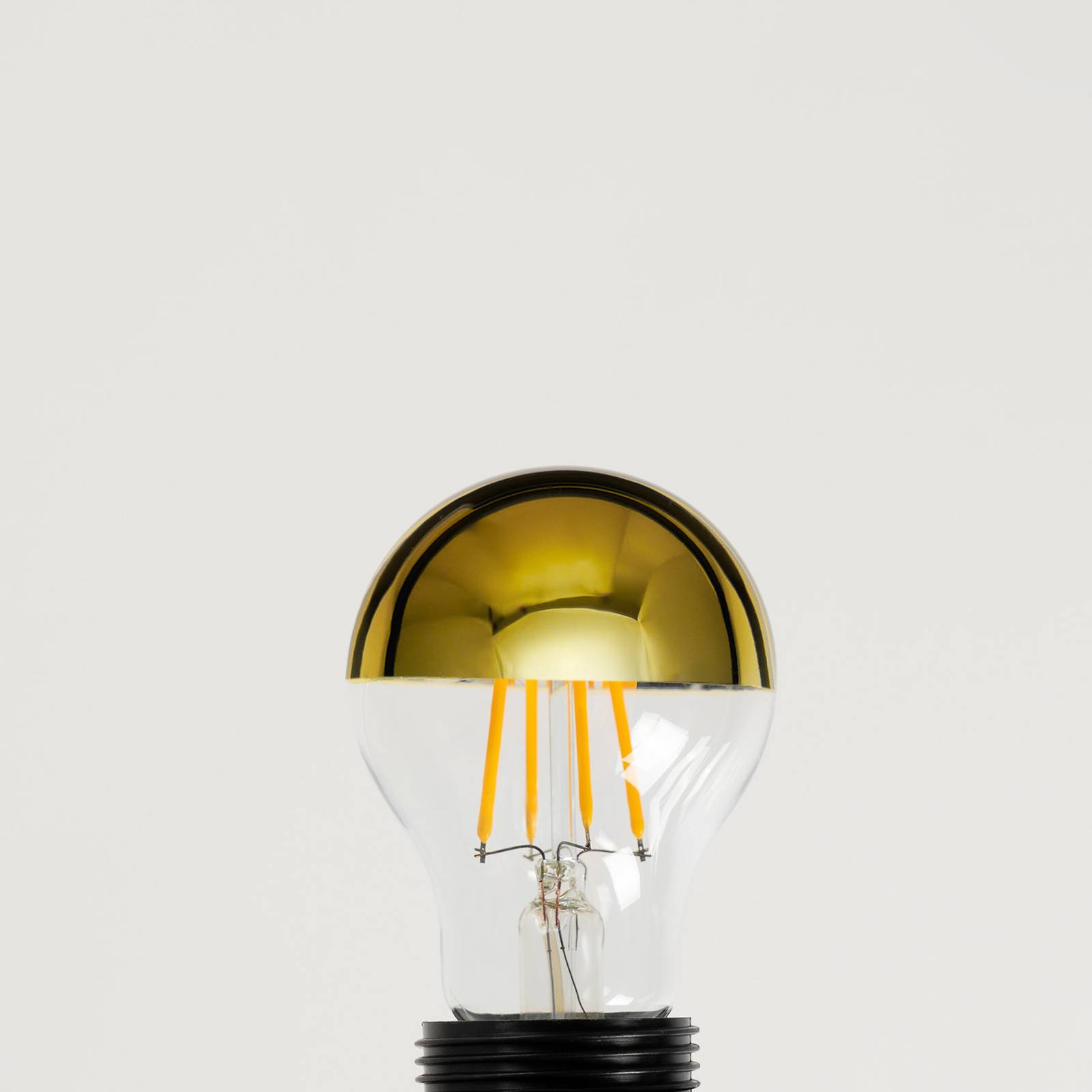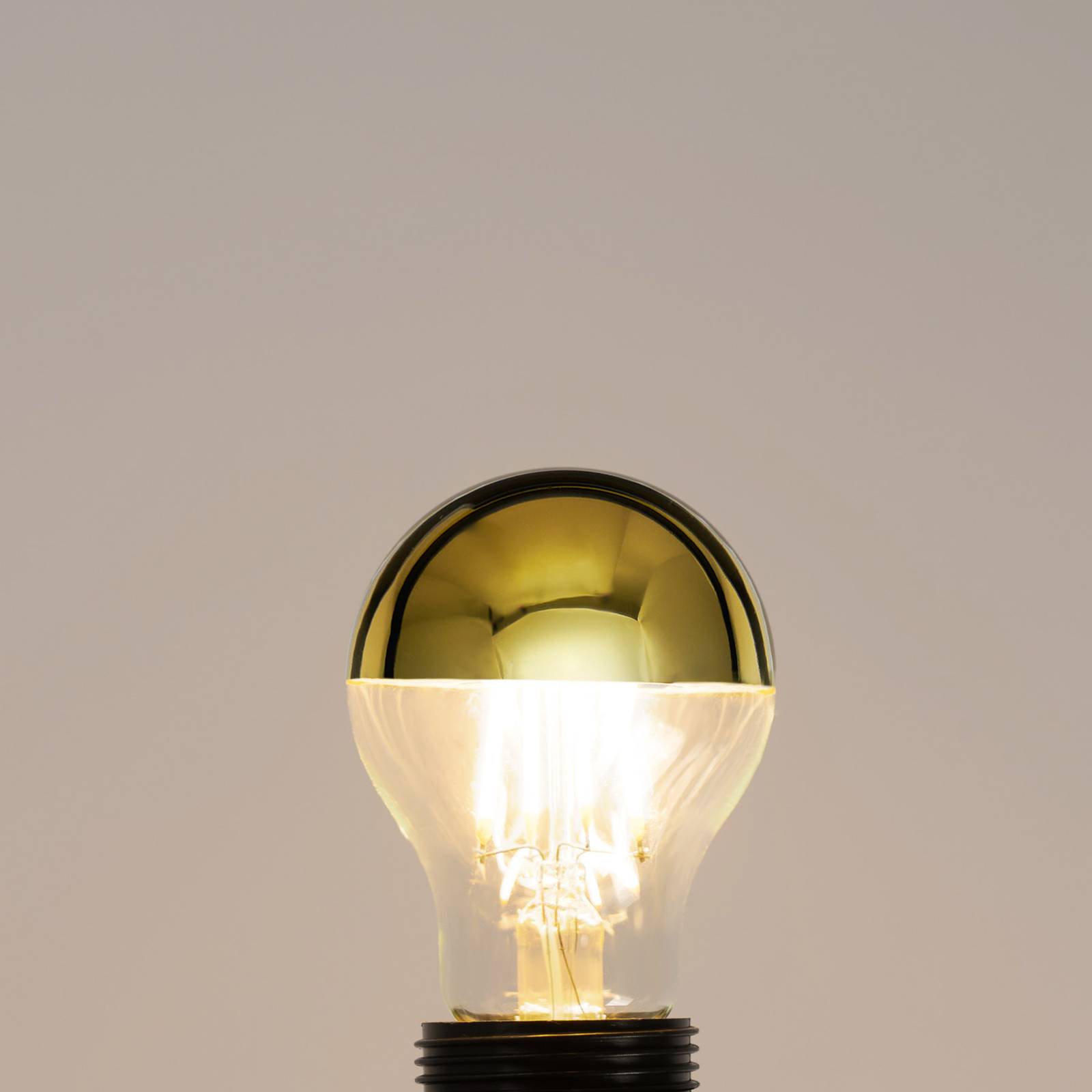 Lampada a specchio da testa a LED E27 con rivestimento dorato, alto indice di resa cromatica, dimmerabile - in un pratico set da 5Questa lampada a testa a specchio ha un aspetto a filamento, ha la classica forma A60 ed è specchiata in oro nella parte superiore, creando una luce molto gradevole e attenuata che, con il suo colore di luce bianco caldo, è anche ben consigliata per le zone giorno e gli apparecchi aperti. Se necessario, la lampada LED può essere dimmerata esternamente e l'elevato valore CRI promette una resa cromatica particolarmente buona.Dati tecnici:- dimmerabile- CRI > 90- testa specchiata in oro, ideale per apparecchi aperti- 2.700 K