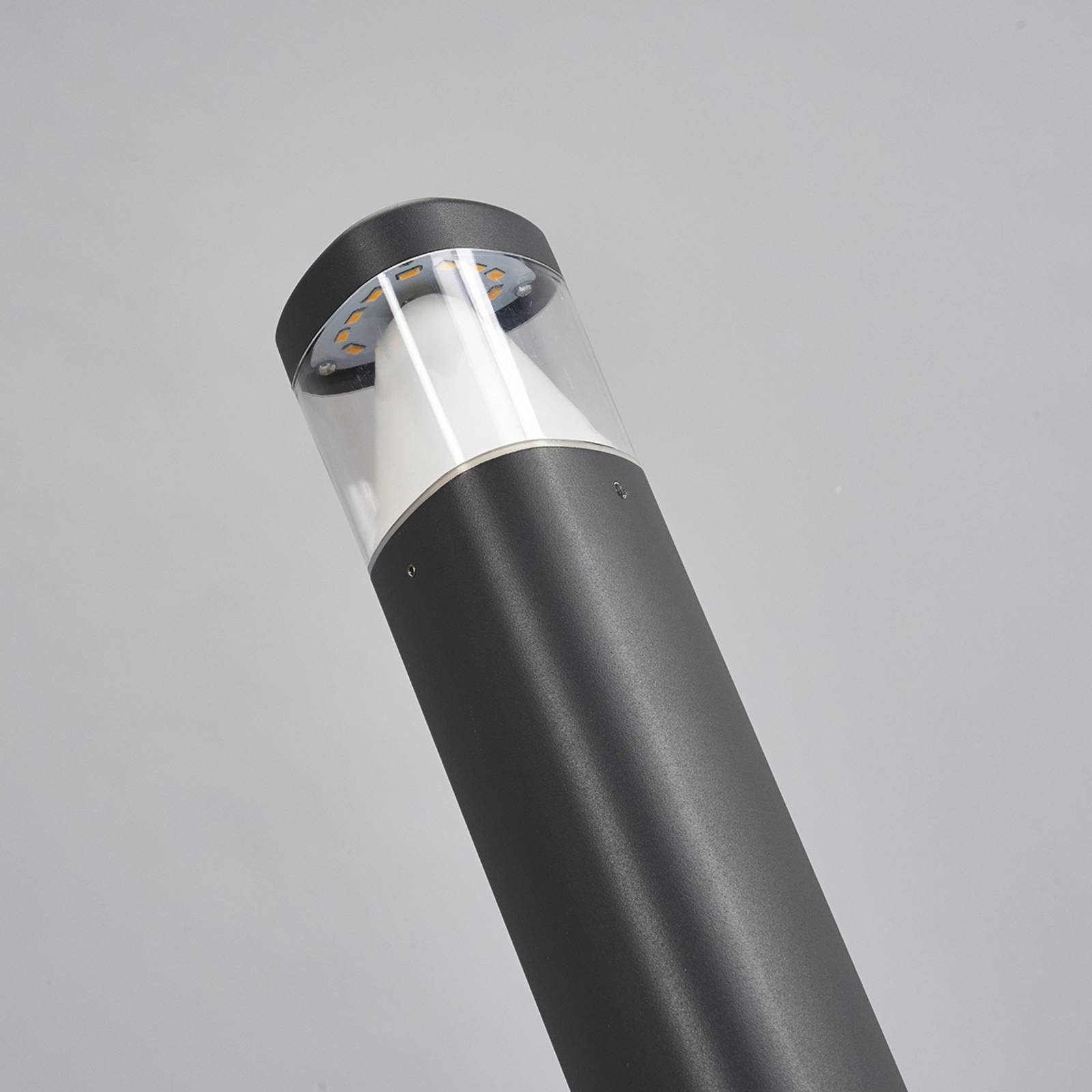 Lampione Milou, triangolare, con LED Osram Il lampione Milou è costruito in alluminio pressofuso e presenta un design contemporaneo. La superficie del corpo triangolare è verniciato color antracite, nella parte superiore è posto un inserto in policarbonato e dietro una lampadina a LED.
