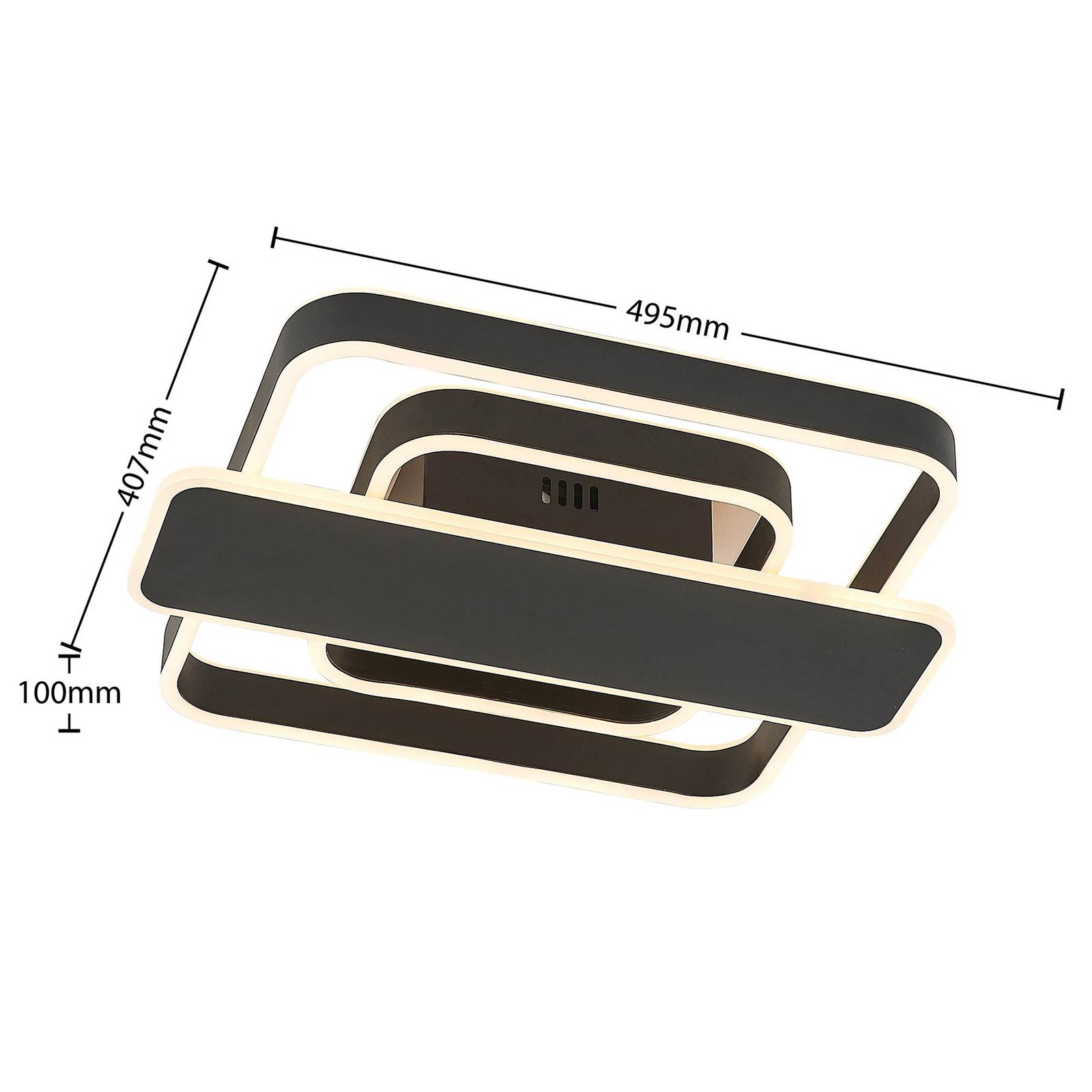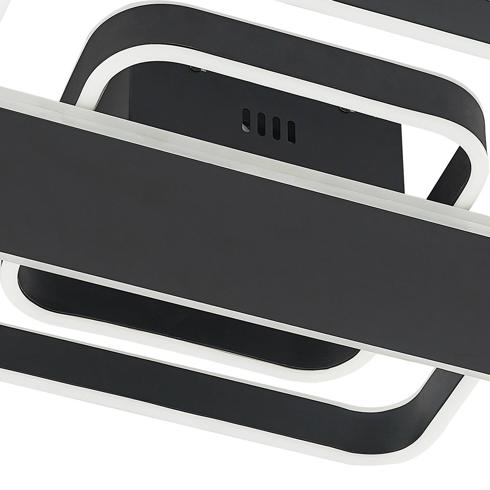Plafoniera LED nera Linetti per ambienti moderni La plafoniera LED Linetti è dotata di numerosi LED che si trovano sotto uno strato protettivo satinato in silicone. La struttura della lampada è realizzata in metallo e rifinita in nero. Composto da due quadrati illuminati di dimensioni diverse e da un rettangolo centrale che si trova sopra il copri cavo, Linetti colpisce per la sua forma particolare. Con un interruttore a parete è possibile accendere e spegnere l'apparecchio come di consueto. Grazie alla tecnologia di dimmerazione a 3 fasi con funzione di spegnimento integrata, può essere regolata su tre diversi livelli di luminosità premendo più volte l'interruttore: 100%, 40% e 15%.