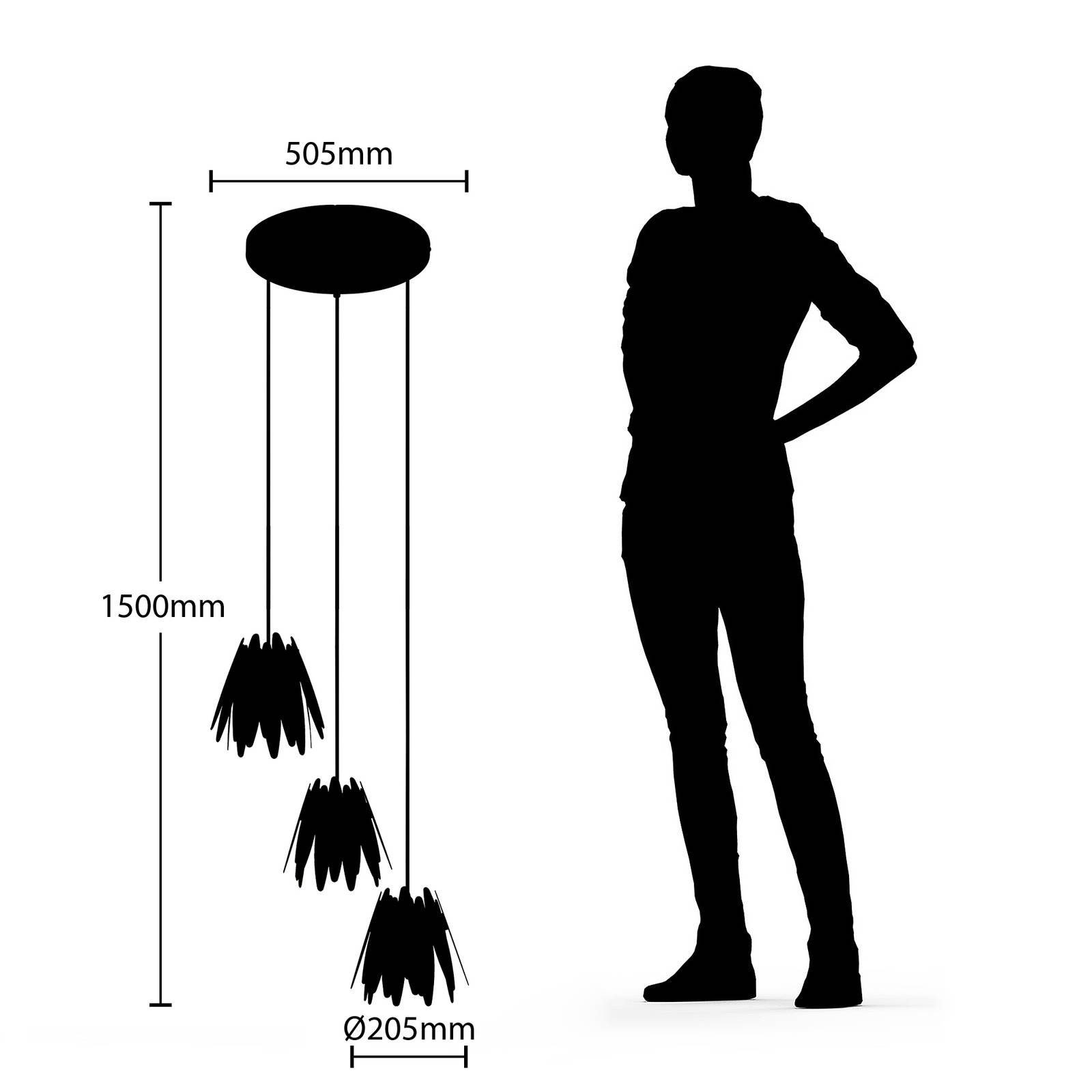Bellissimo insieme di design composto da tre paralumi in metallo a forma di ventaglio in nero e oro: l'apparecchio a sospensione Lounit Qui i classici paralumi sembrano essere stati radicalmente reinterpretati, perché l'apparecchio a sospensione di design Lounit ha tonalità che appaiono abbastanza classiche nella forma (rotonde e più strette verso l'alto), ma allo stesso tempo hanno un'espressione molto trendy e orientata al design. Questo perché il design è di una leggerezza giocosa, ma l'apparecchio stesso è fatto di metallo forte e solido. La tensione che ne deriva rende l'apparecchio un oggetto d'illuminazione unico per la zona giorno, dove l'apparecchio può essere utilizzato soprattutto sopra un tavolo da pranzo. I segmenti metallici ovali arrotondati, di forma allungata, sono disposti attorno al portalampada quando vengono montati tramite un sistema ad innesto. Sebbene il metallo sia opaco, la speciale disposizione a ventaglio crea attraenti effetti di luce che possono essere ammirati anche come belle ombre nella stanza. L'illuminazione dell'ambiente appare piacevole e leggera ed è caratterizzata da un effetto accogliente, mentre le aree utili sotto l'apparecchio sono molto ben illuminate.