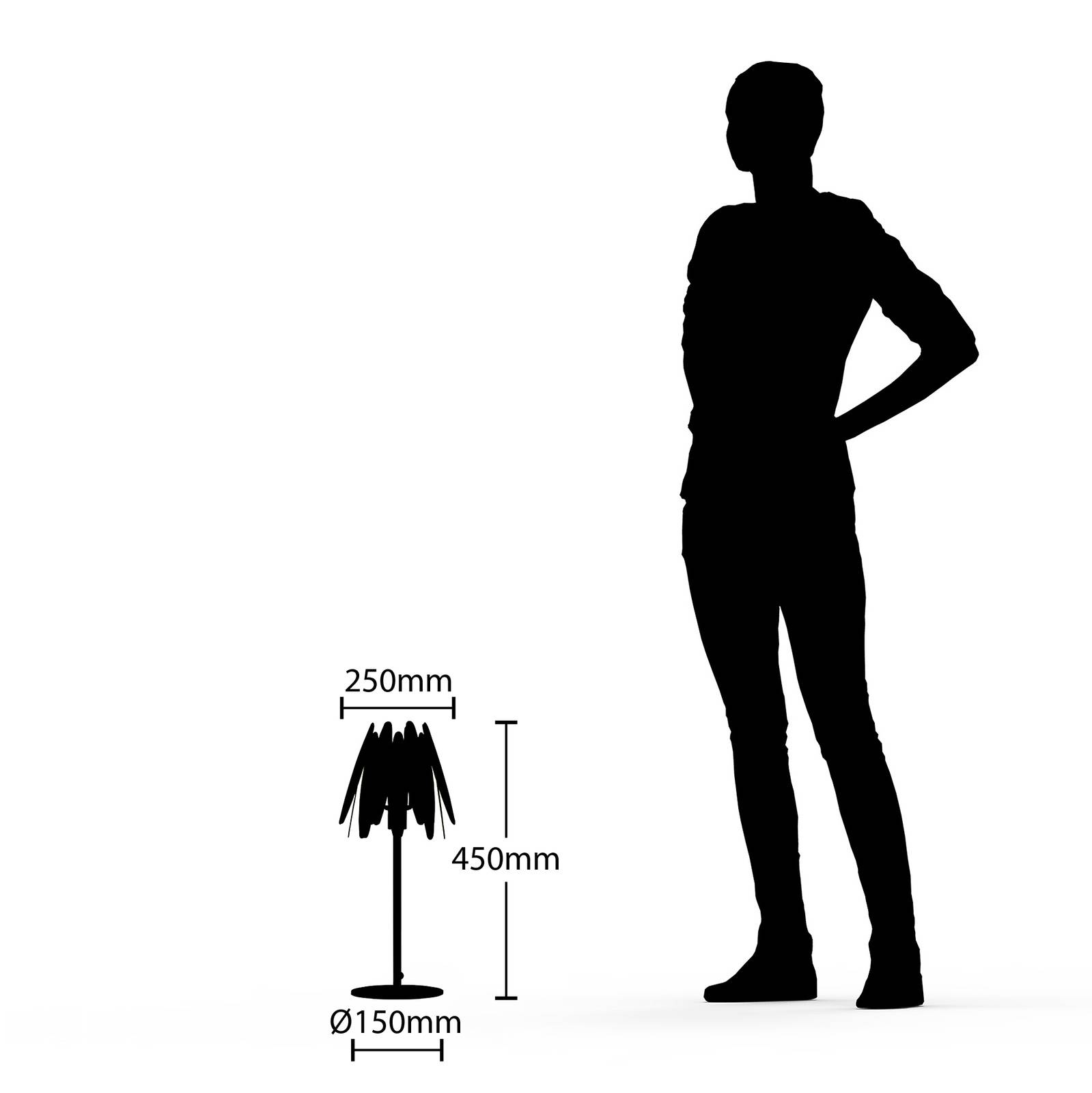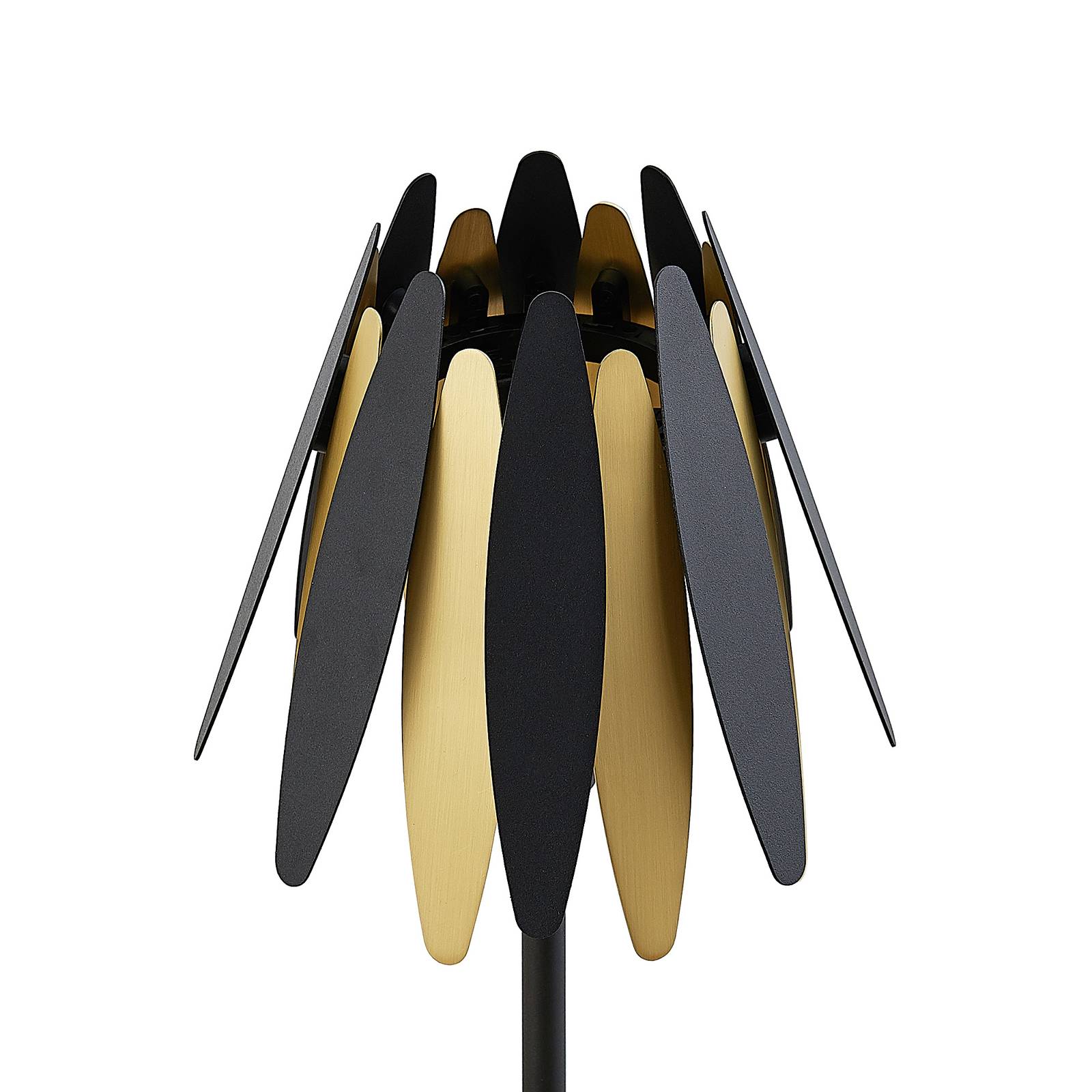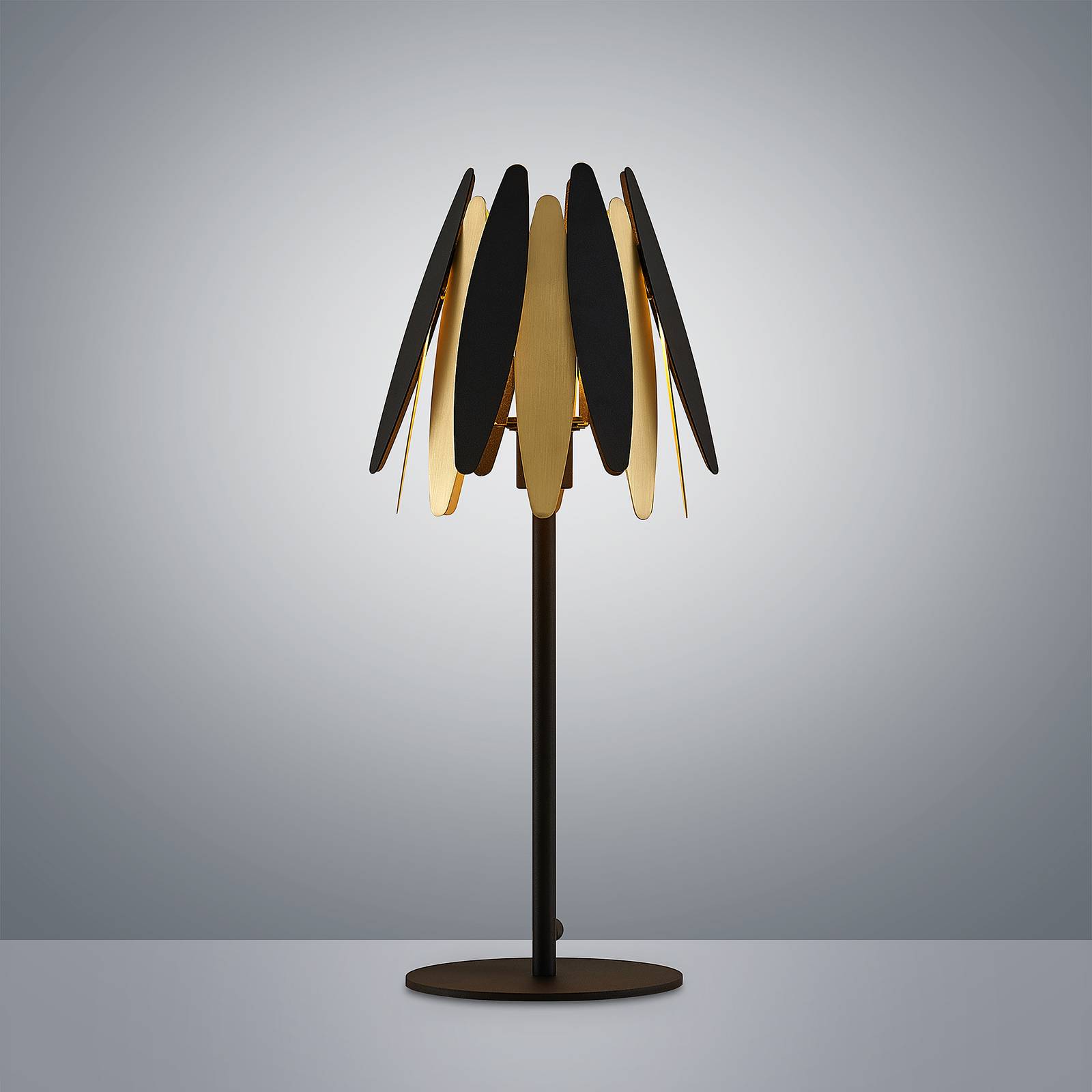 Lampada da tavolo di design nero-oro Lounit con paralume a ventaglio in metallo Se volete, un classico paralume è stato qui radicalmente reinterpretato in questa lampada da tavolo di alta qualità, che è aperta in alto e in basso e si assottiglia un po' in alto. Si riconosce la forma di base universalmente nota, ma c'è anche questo aspetto generale molto individuale. In senso stretto, il paralume non è costituito da un insieme, ma piuttosto da diversi componenti metallici piuttosto ovali o allungate e arrotondate in nero e oro, che vengono inseriti singolarmente durante il montaggio e insieme creano un aspetto a ventaglio. Sebbene i segmenti siano in metallo e quindi per la prima volta opachi e opachi, producono effetti di luce attraenti che, a seconda del loro posizionamento nella stanza, possono essere visti anche come un bel gioco di ombre sulla parete. Naturalmente, questo metodo di costruzione non provoca quasi nessun abbagliamento e la luce brilla in modo molto piacevole e accogliente, anche se le aree utili direttamente a portata di mano dell'apparecchio sono ben illuminate. Un bellissimo oggetto di design tra le luci, che combina armoniosamente i colori di tendenza nero e oro! L'interruttore si trova nella linea di alimentazione a spina e può essere azionato rapidamente.