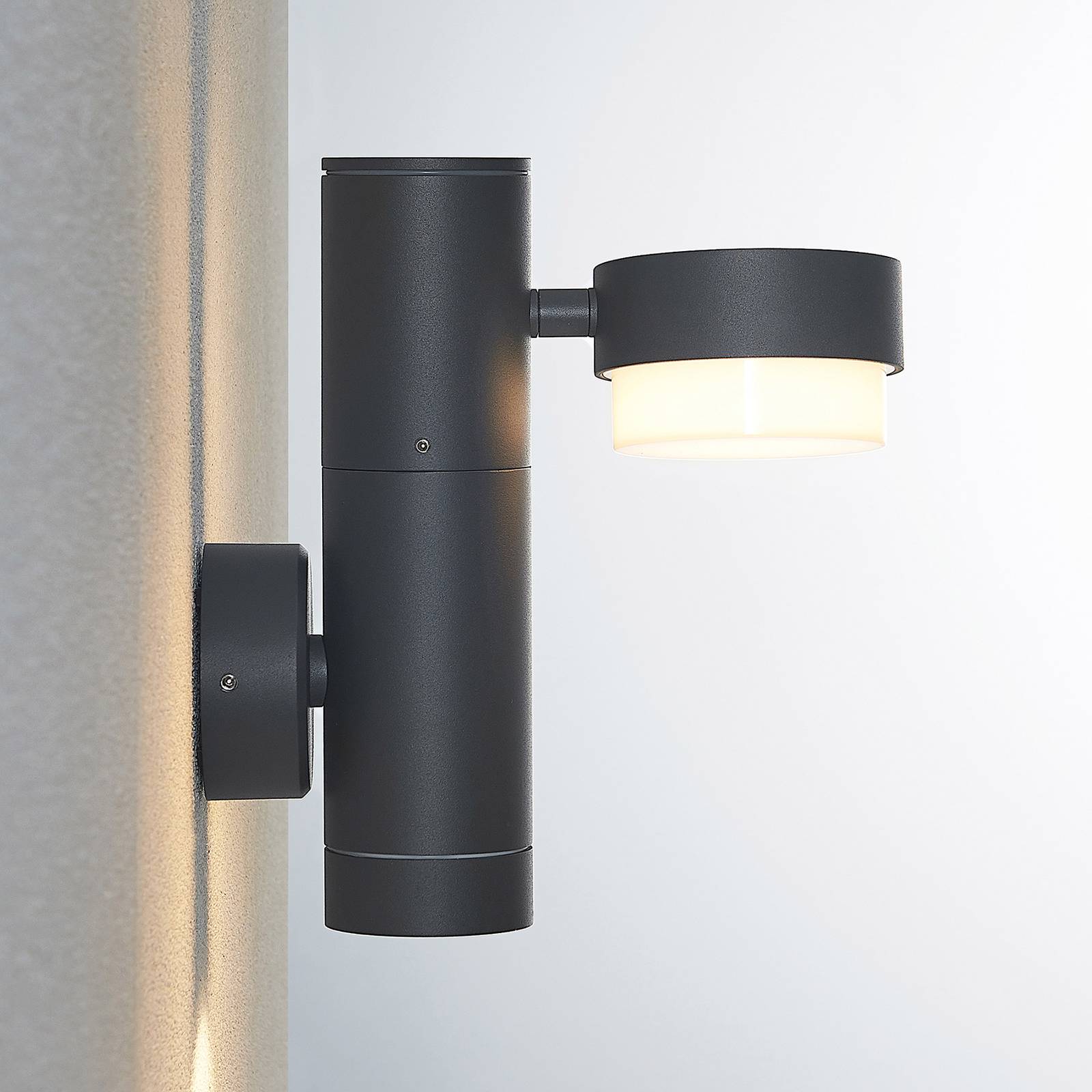 Lampada da parete per esterni a una luce Marvella dal design moderno in alluminioLa lampada da parete per esterni Marvella convince per il suo design discreto e solido. È realizzato in alluminio e si presenta in un semplice colore grigio scuro. Il corpo della lampada ha una forma minimalista, che risulta da un tubo e da un paralume compatto e circolare. Il suo paralume può essere dotato di lampade appropriate e quindi genera sempre una luce adeguata. La lampada da parete per esterni Marvella è protetta da polvere e spruzzi d'acqua con grado di protezione IP54.