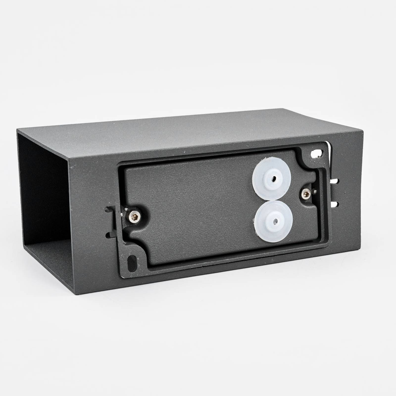 Applique LED da esterni Mikka con fascio luminoso verso l'alto e il basso Mikka è un'applique LED da esterni di essenziale forma quadrata. Si fa notare solo per la sua doppia emissione. I due coni di luce, puntati in alto e in basso, si disegnano nitidamente sulla parete formando un effetto molto decorativo e ben visibile anche da lontano. I LED incorporati sono garanti di ottima efficienza energetica: vale a dire luce consistente e poco consumo.
