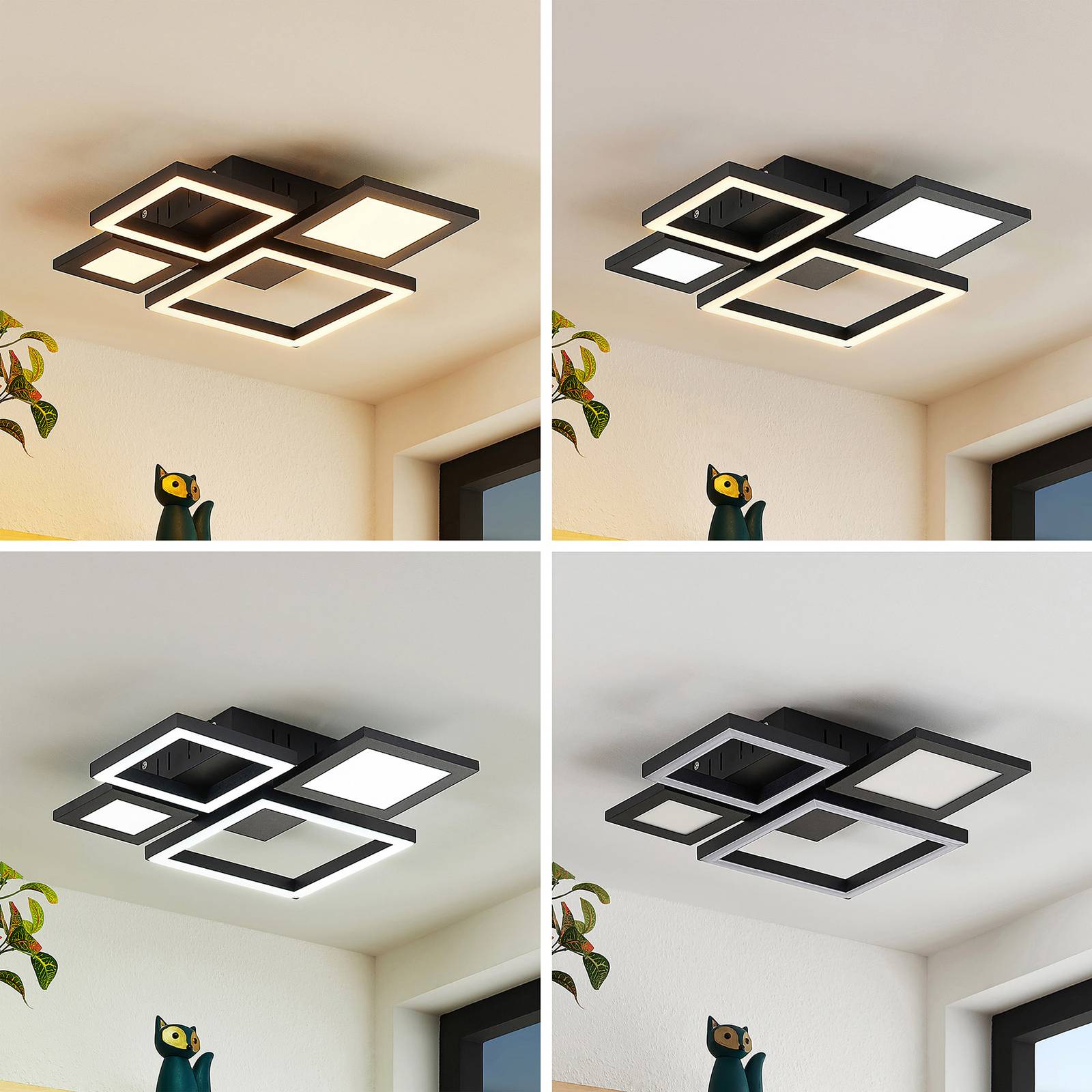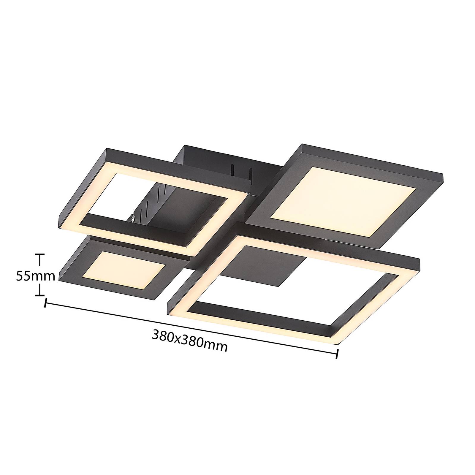Plafoniera LED Narumi geometrica con molte funzioni utili La plafoniera LED Narumi fa sicuramente la sua figura sul soffitto del soggiorno, poiché si distingue per il suo Look orientato al design. È realizzata prevalentemente in alluminio e ferro e presenta una classica finitura nera. Il telecomando in dotazione offre numerose funzioni, come il dimmer continuo dal 10% al 100% di luminosità e la regolazione della temperatura di luce tra 2.700 K e 6.500 K. Anche la funzione di memoria può essere attivata comodamente con il telecomando. Die ricorda la luminosità e il colore di luce utilizzati l'ultima volta 6 secondi dopo l'accensione o 10 secondi dopo lo spegnimento. La modalità notturna può anche essere selezionata opzionalmente tramite il telecomando. Il colore di luce può essere controllato in più fasi anche con l'interruttore standard, premendolo più volte.