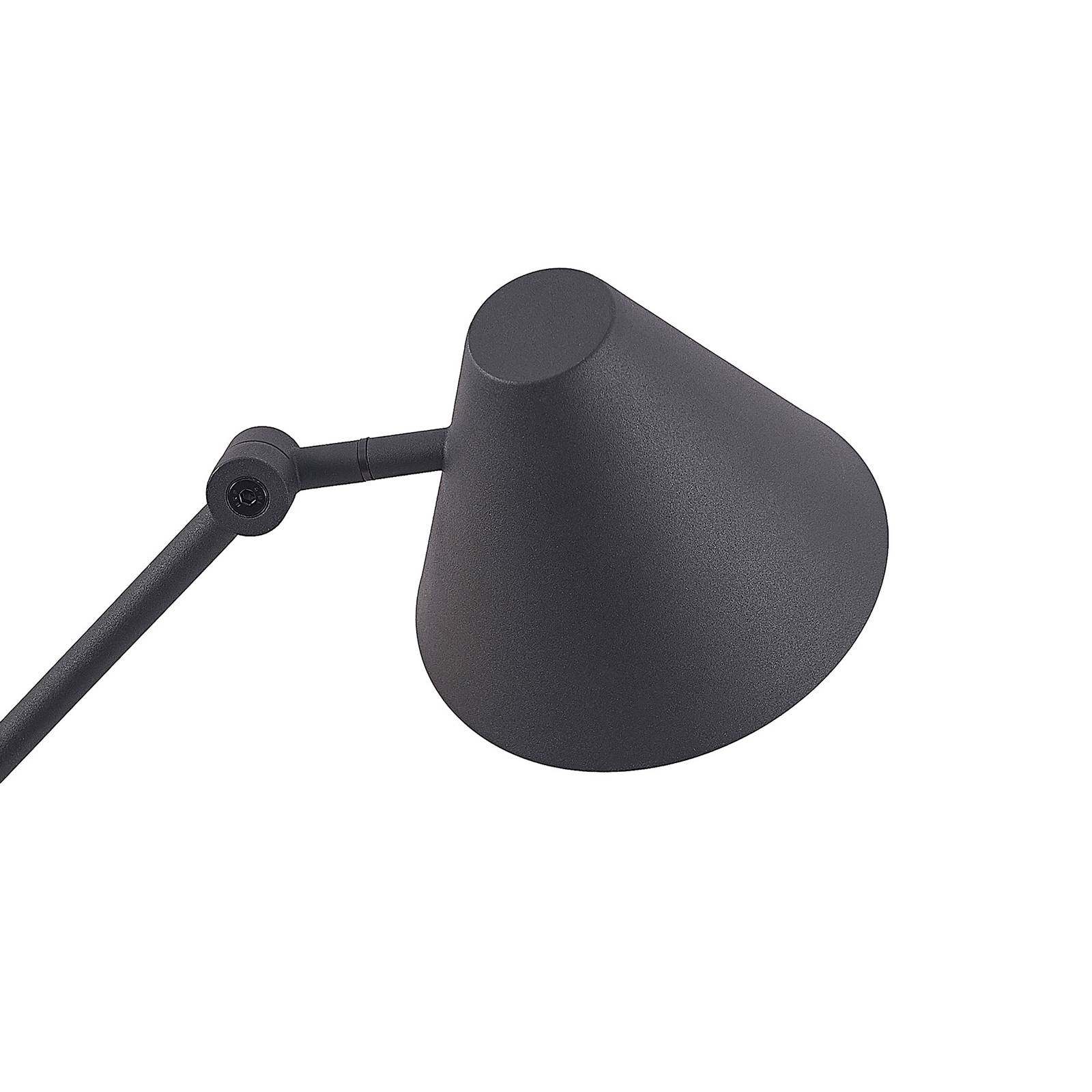 Lampada da parete sottile Phina in acciaio con interruttore a cavo Phina è una lampada da parete sottile, che è particolarmente adatta per l'illuminazione d'accento di un soggiorno. Un braccio lungo e sottile si alza da una staffa a muro, che ha due snodi mobili e termina con un discreto paralume. Il telaio e il paralume sono entrambi in acciaio nero e l'interno del paralume è rivestito di un bianco armonioso. Questo attraente contrasto di colore dà alla lampada quel certo qualcosa e completa il suo design. Phina può essere equipaggiata con lampadine E27, che generano la luce necessaria. L'aspetto piuttosto discreto dell'apparecchio si integra senza sforzo nel resto dei mobili e si adatta bene agli stili di arredamento moderni. Se necessario, Phina può essere combinata con altri apparecchi della sua serie per creare un quadro generale coerente.