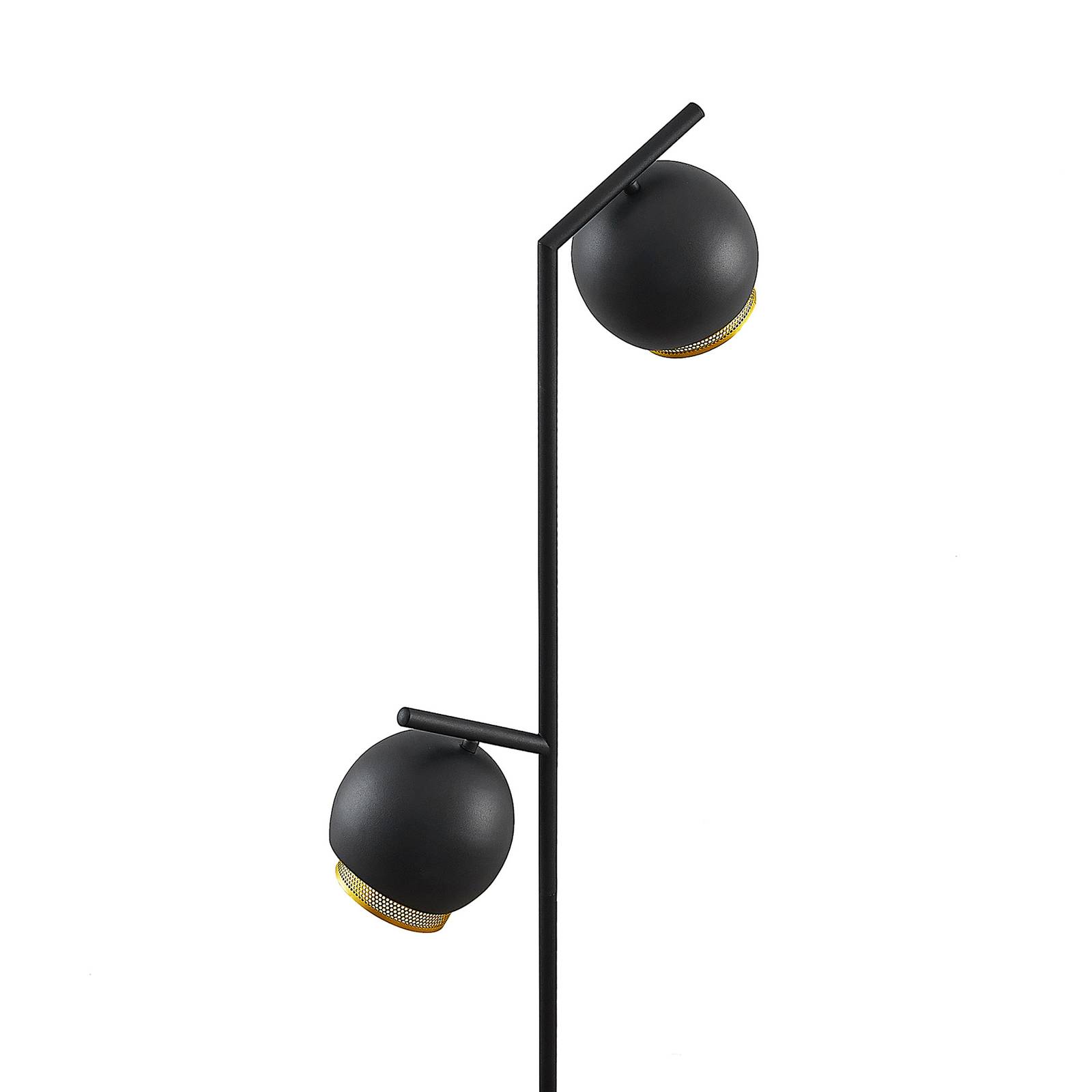 Lampada da terra scura Sivanel con due tonalità sferiche doppie La lampada da terra Sivanel attira immediatamente sguardi curiosi con il suo design speciale. Ha una base rotonda e piatta e un telaio sottile che termina con due paralumi sferici. Le tonalità portano una caratteristica interessante, perché consistono in una tonalità esterna scura e una tonalità interna dorata. I colori nero e oro appaiono contrastanti e tuttavia molto armoniosi tra loro e portano una certa eleganza nello spazio vitale. Sivanel non solo può arricchire il proprio salotto, ma è anche sicuro di trovare un posto in un ambiente commerciale.