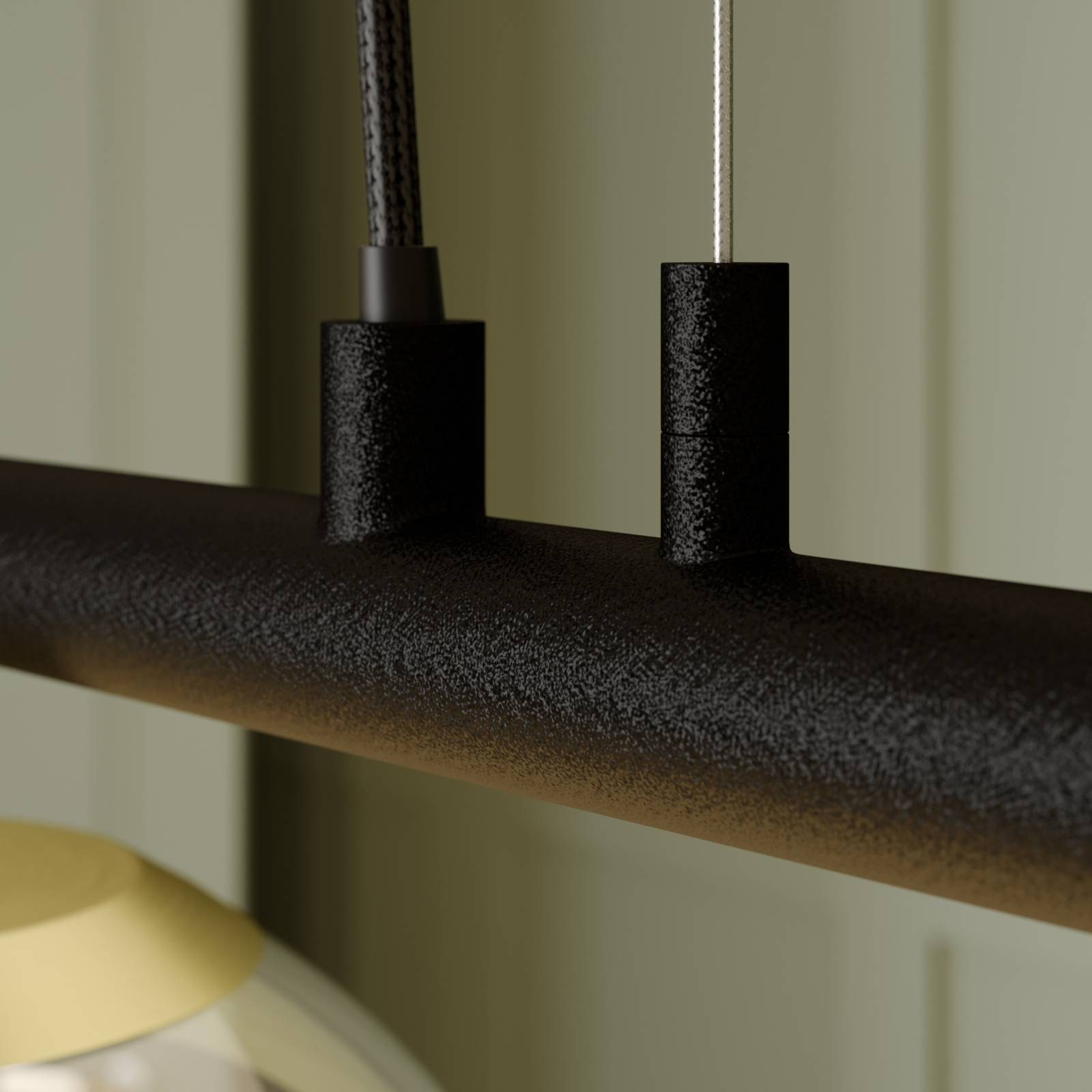 Lampada a sospensione Sotiana di forma allungata con cinque sfere di vetro Sotiana è una lampada a sospensione a trave con cinque paralumi sferici di vetro trasparente, ideali per l'illuminazione di un tavolo da pranzo. Questi paralumi sono allineati lungo una sottile barra metallica nera. I portalampada ben visibili sono di metallo color ottone che forma un armonioso contrasto. Questo look caratterizzato da tre elementi si presenta moderno ma non manca di un certo tocco nostalgico che suggerisce uno stile vintage. Le lampadine costituiscono parte integrante dell'aspetto d'insieme. Per questo vale la pena scegliere modelli intonati allo stile. Si consigliano lampadine LED a filamenti a forma di goccia con attacco E14. Per un'illuminazione vivace e di stile in sala da pranzo!