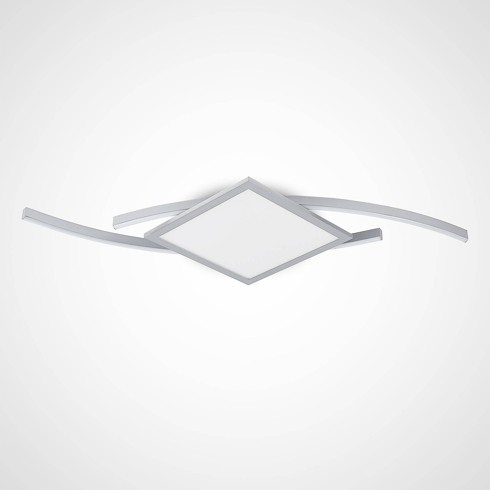 Plafoniera a LED Tiaro in alluminio e ferro con pratica funzione dimmerabile La plafoniera a LED argento Tiaro si presenta con un design rinfrescante. Due montanti a spazzola sono fissati orizzontalmente ad una staffa a soffitto, che sono collegati da un elemento quadrato e generano così un esterno di grande effetto. All'interno della piazza si trova un modulo LED fisso la cui luce può essere dimmerata con l'interruttore a parete di uso quotidiano. Utilizzando la tecnologia di dimmerazione a 4 stadi e la regolare funzione di spegnimento, la luce può essere dimmerata al 100%, 60%, 30% e 13% della sua luminosità abituale e accesa e spenta come al solito. Questo avviene premendo più volte l'interruttore a muro. L'aspetto moderno della plafoniera a LED Tiaro trova un posto speciale soprattutto nelle camere da letto o nei salotti, inoltre, con le sue caratteristiche pratiche è una luce affidabile e flessibile. Si integra senza sforzo in un'ampia varietà di stili d'arredamento e si fonde senza sforzo con il resto dei mobili.